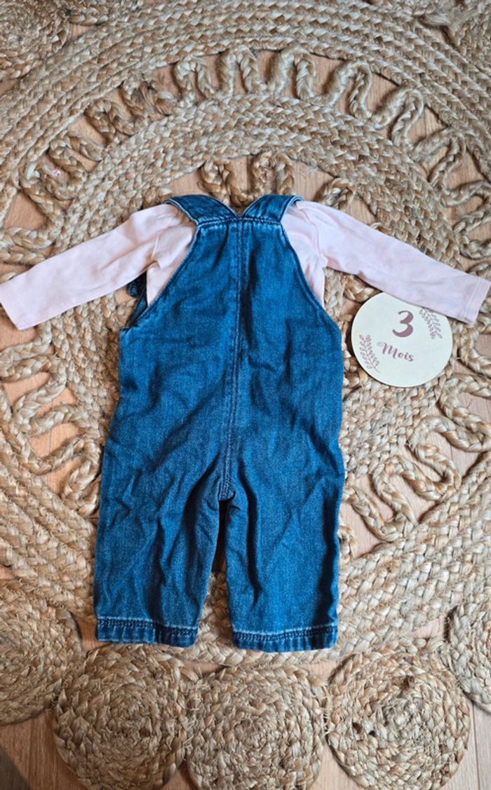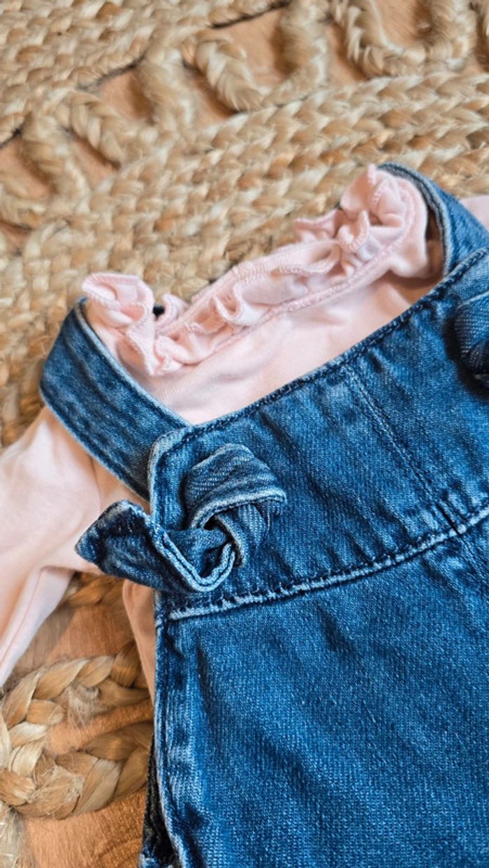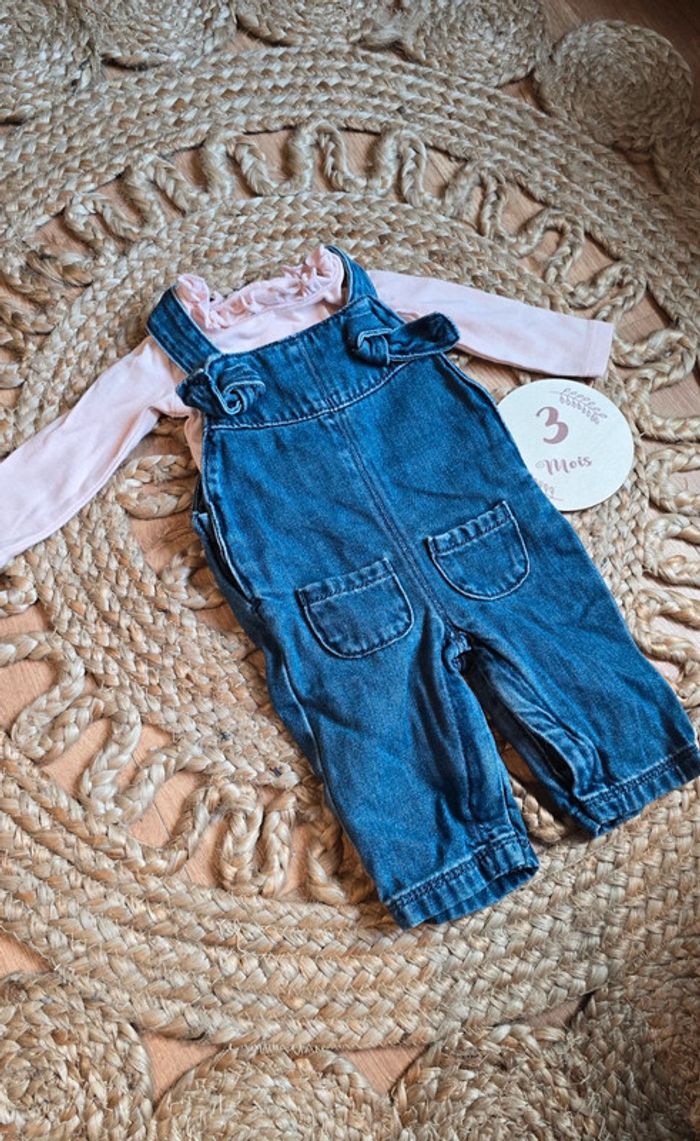 Ensemble combinaison salopette Tape à l'œil jean bleu, bretelles réglables, ouverture sur le bas et body col à volants rose pâle Obaibi, taille 3 mois, très bon état #tapealoeil #bébé #bébéfille #salopette #3mois #lot #tao