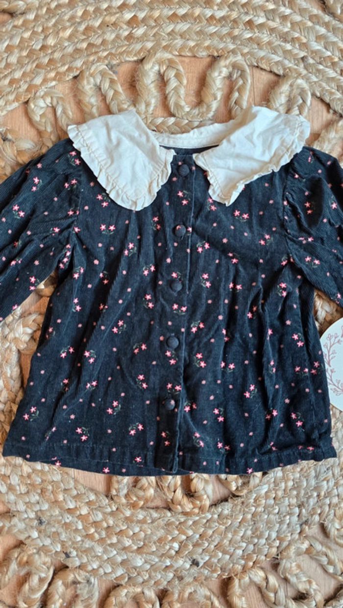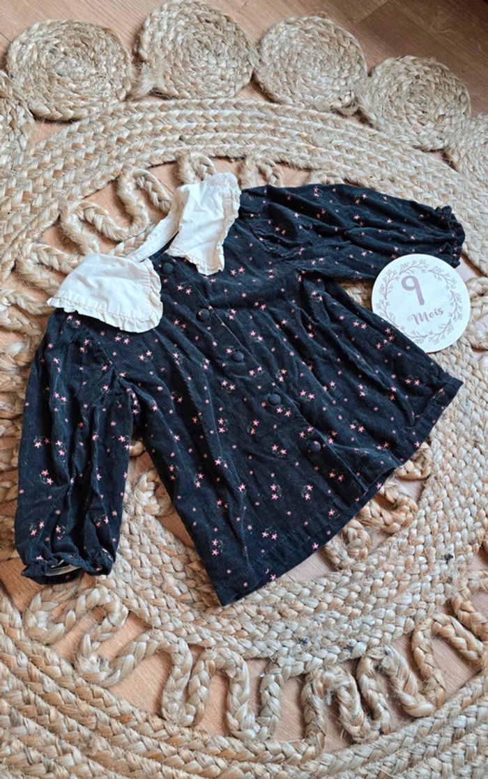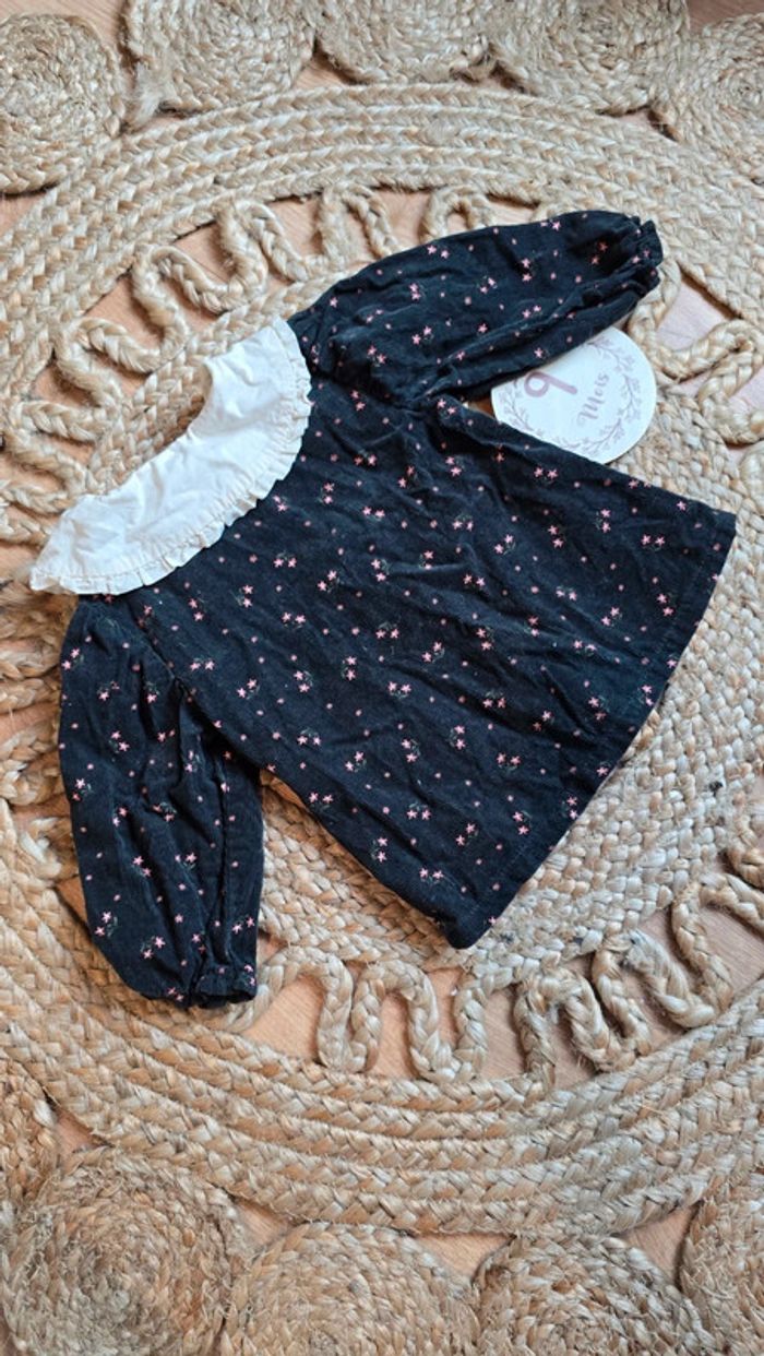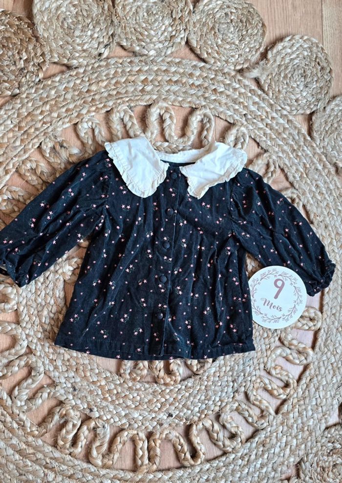 Haut blouse Kiabi en suédine velours noir à imprimé fleuri rose, col replié écru à volants, boutons devant, taille 9 mois, très bon état #blouse #kiabi #bébéfille #lot #bébé #9mois
