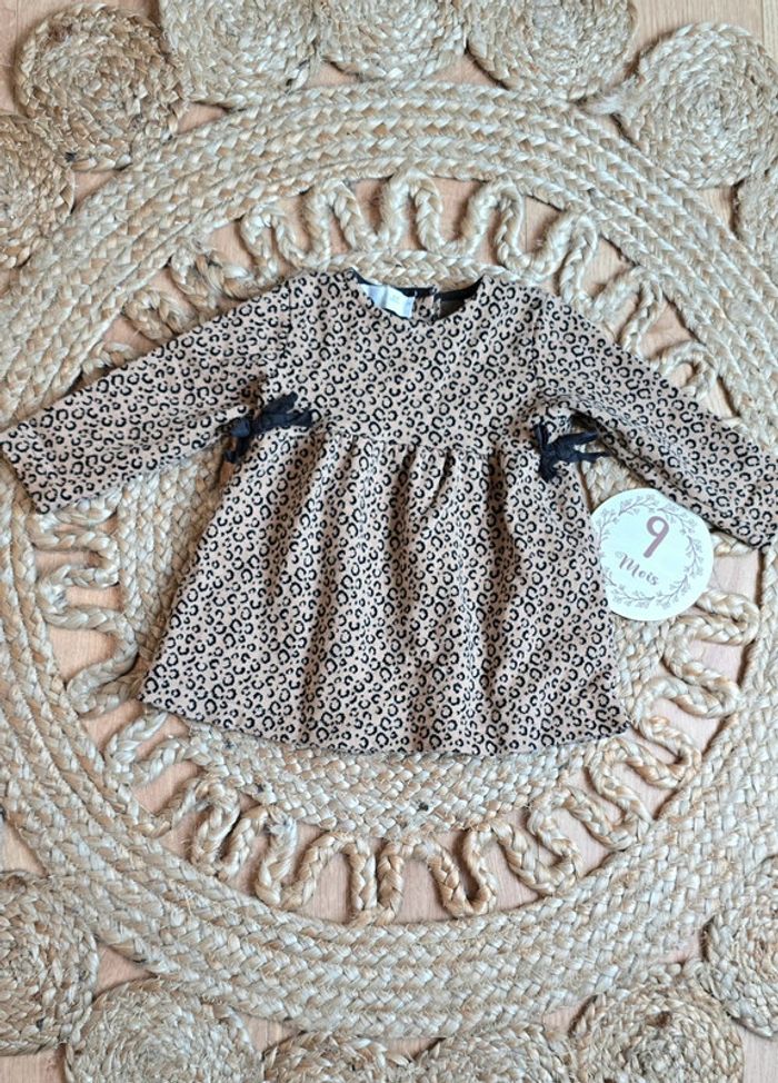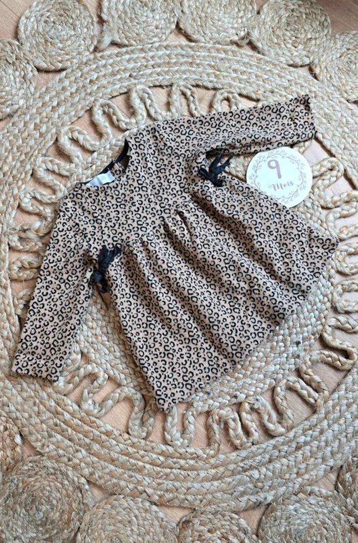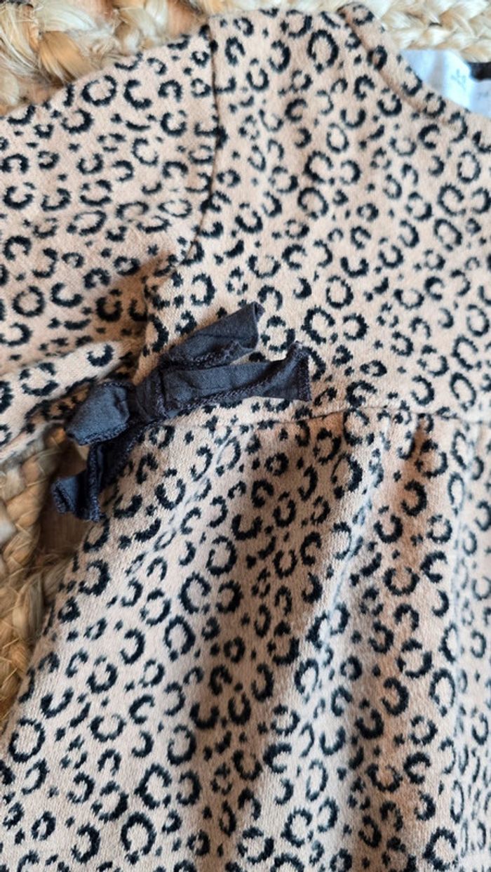 Robe Zara beige et noir imprimé léopard, détails noeud noir, bouton au dos, taille 6/9 mois 74 cm, très bon état #leopard #zara #bébé #robe #lot