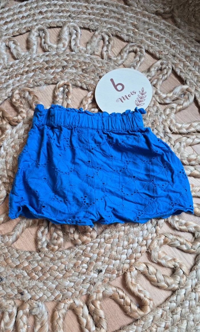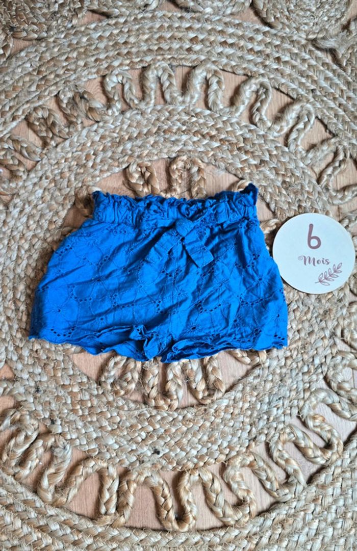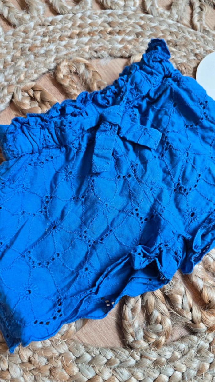 Short Tape à l'œil bleu foncé, détail dentelle crochet fleuri, noeud à la taille, taille 6 mois, mis une fois #short #dentelle #crochet #tapealoeil #tao #lot #6mois
