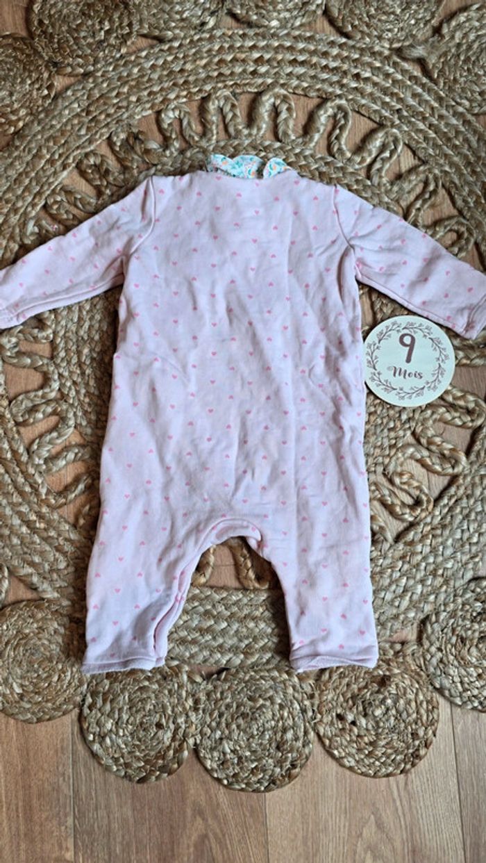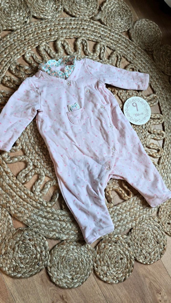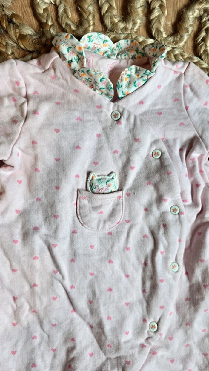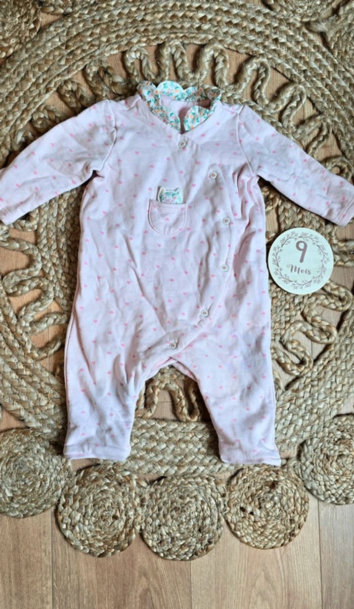 Pyjama grenouillère Sergent Major, rose pâle, détails cœur rose foncé, col replié fleuri, détails chat, sans pieds, pressions sur le devant, taille 9 mois, très bon état #pyjama #bébé #bébéfille #lot #sergentmajor #été