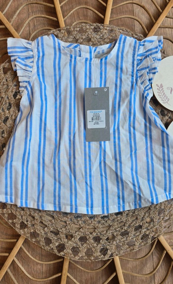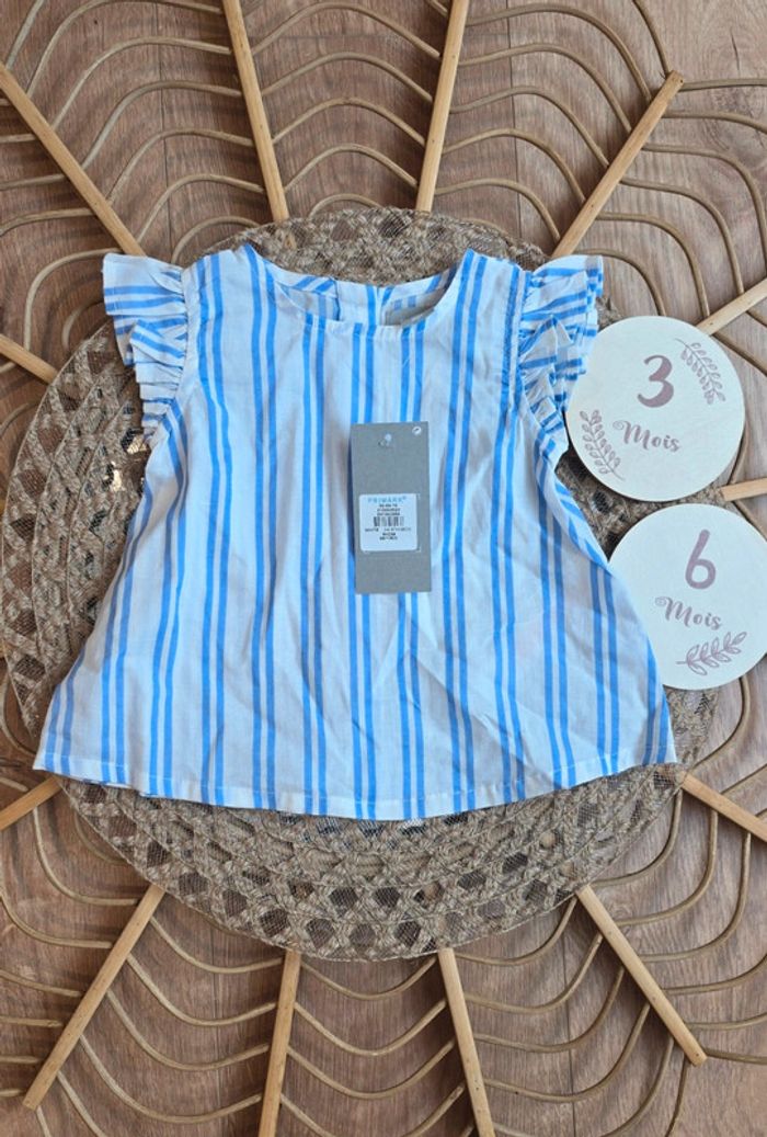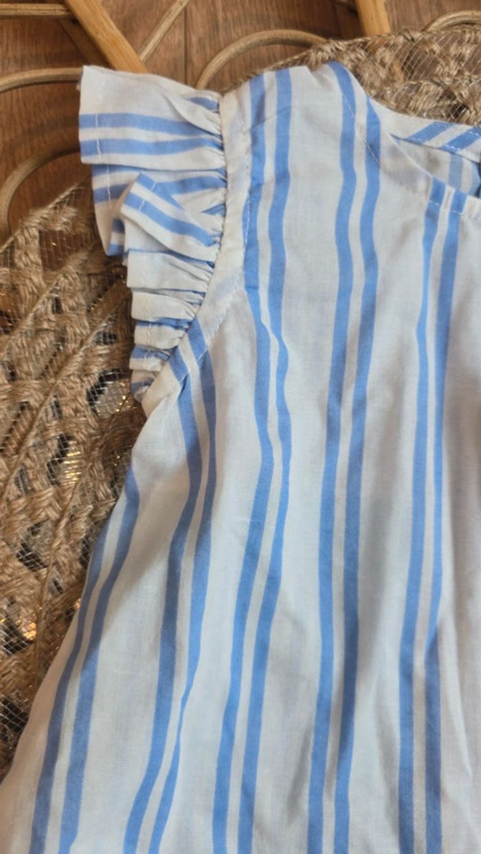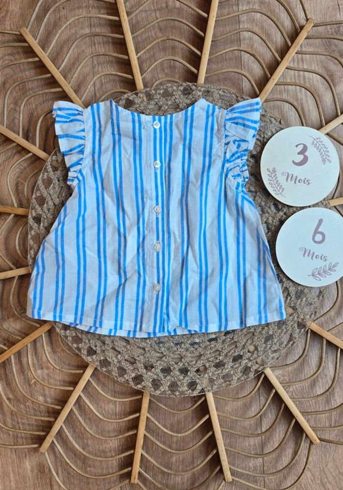 Blouse chemisier blanc a rayures bleu, volants aux manches, boutons au dos, taille 3/6 mois, neuf avec étiquette #blouse #rayures #3mois #bébé #bébéfille #3mois #lot