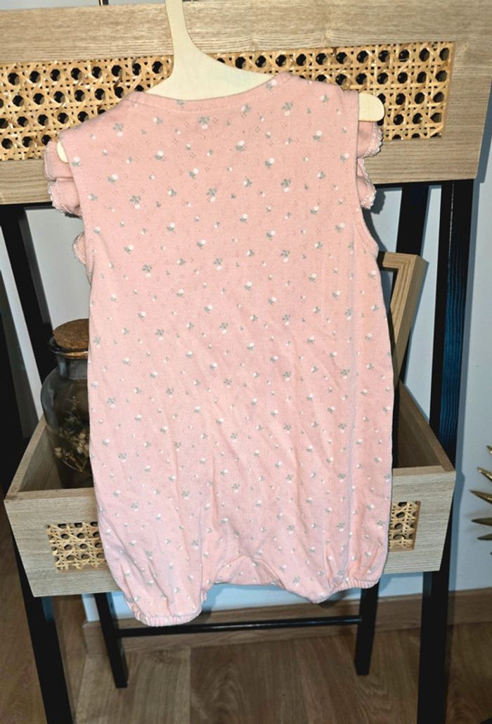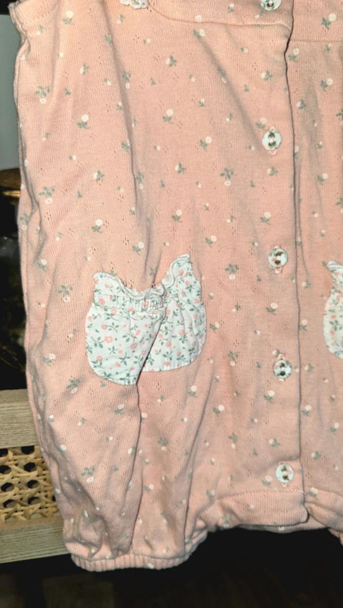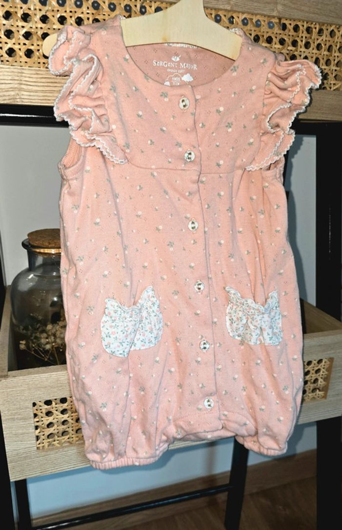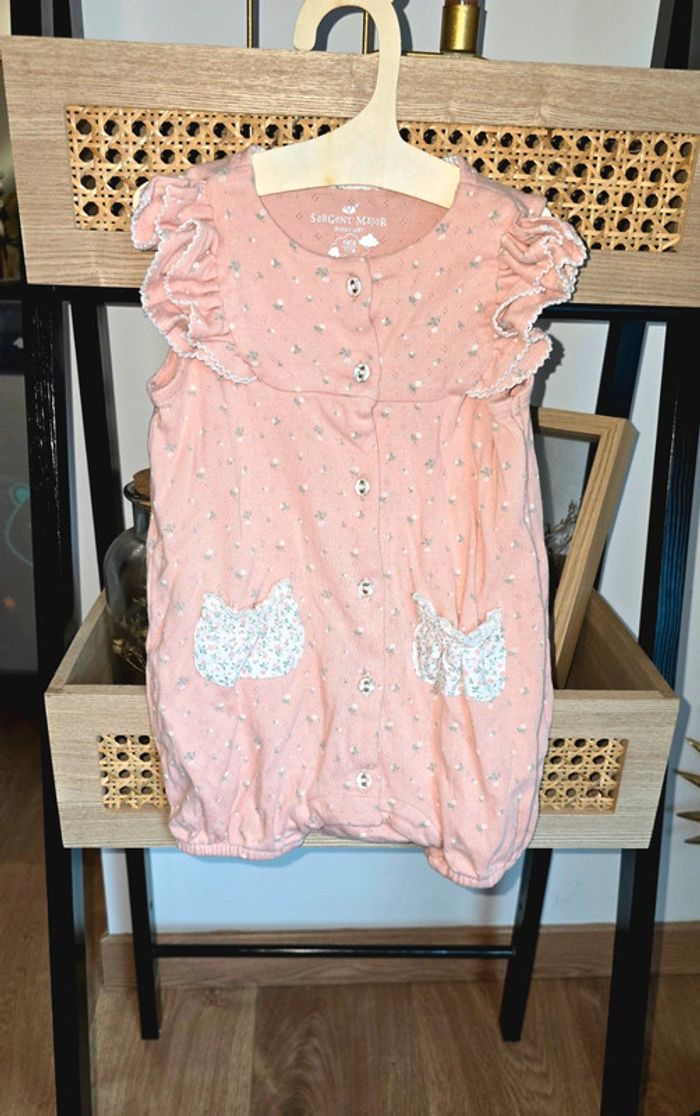 Pyjama grenouillère barboteuse Sergent Major, rose, dentelle et fleurs, volants, boutons sur le devant et pressions sur le bas, taille 9 mois, mis une fois comme neuf #sergentmajor #été #barboteuse #pyjama #sergentmajor #lot #grenouillère #9mois