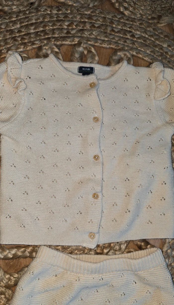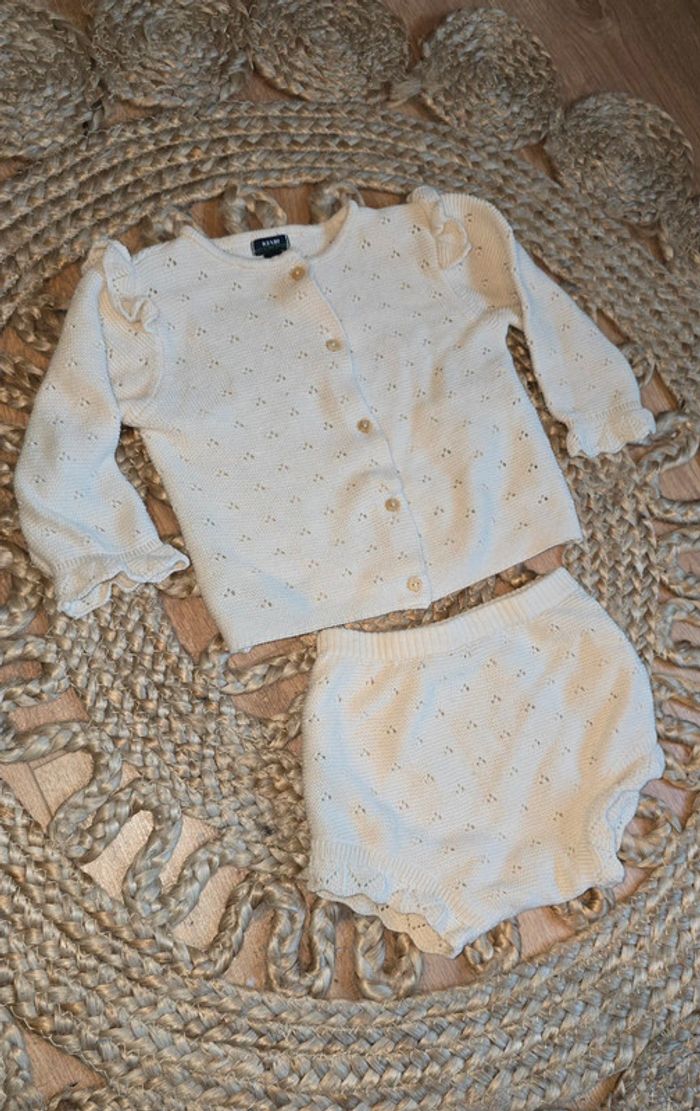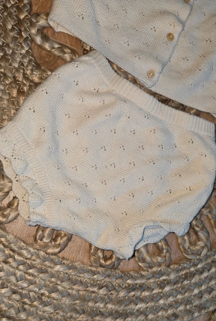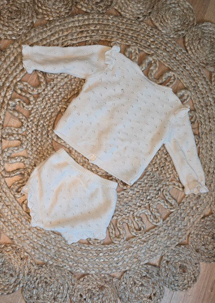 Ensemble Kiabi en maille crochet beige écru, haut à boutons, bas culotte bloomer, taille 6 mois, très bon état #kiabi #ensemble #maille #crochet #bébé #bébéfille #lot