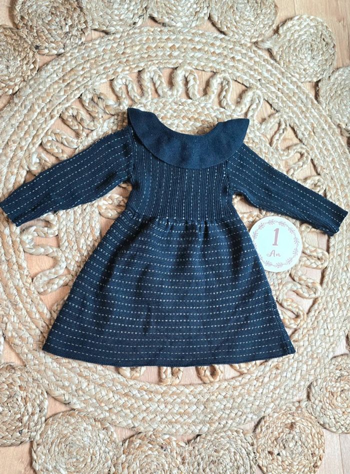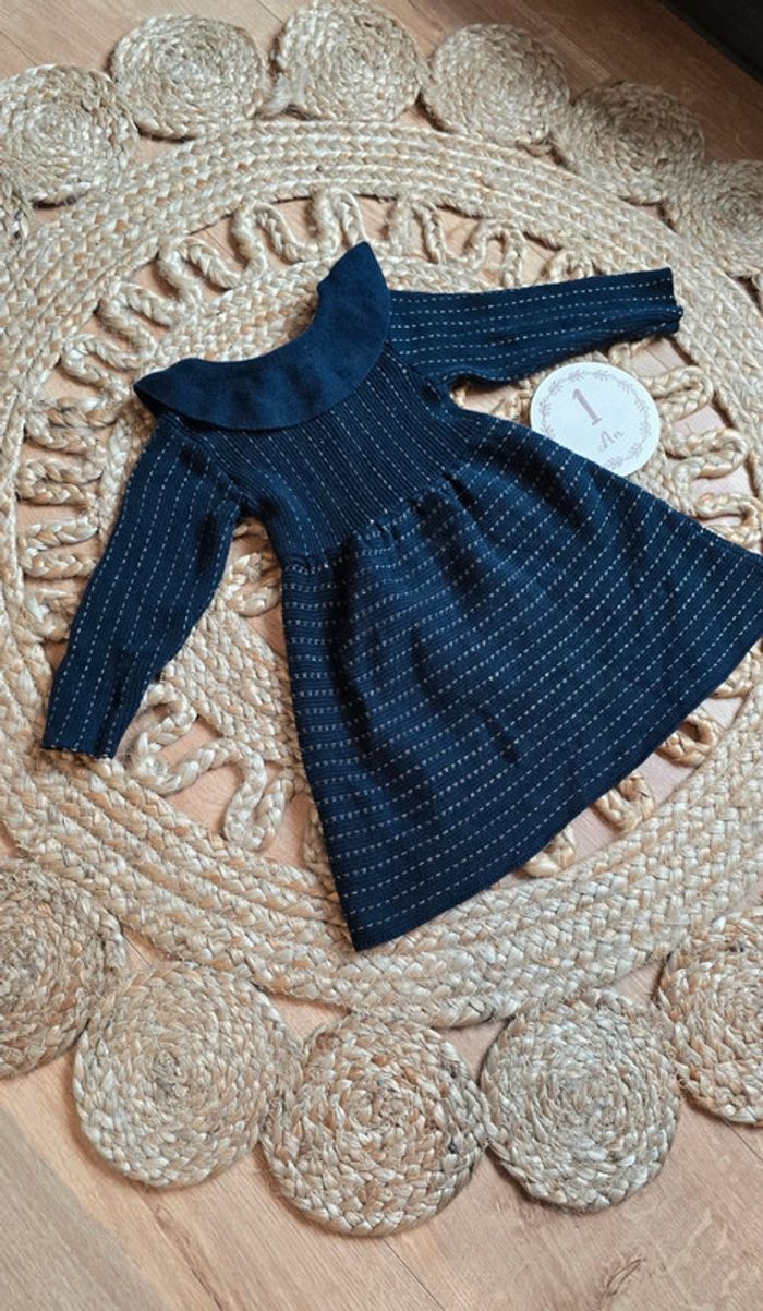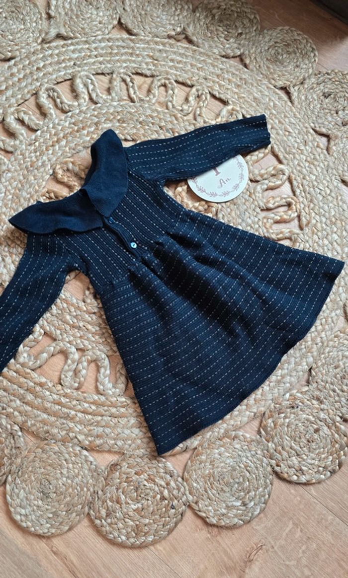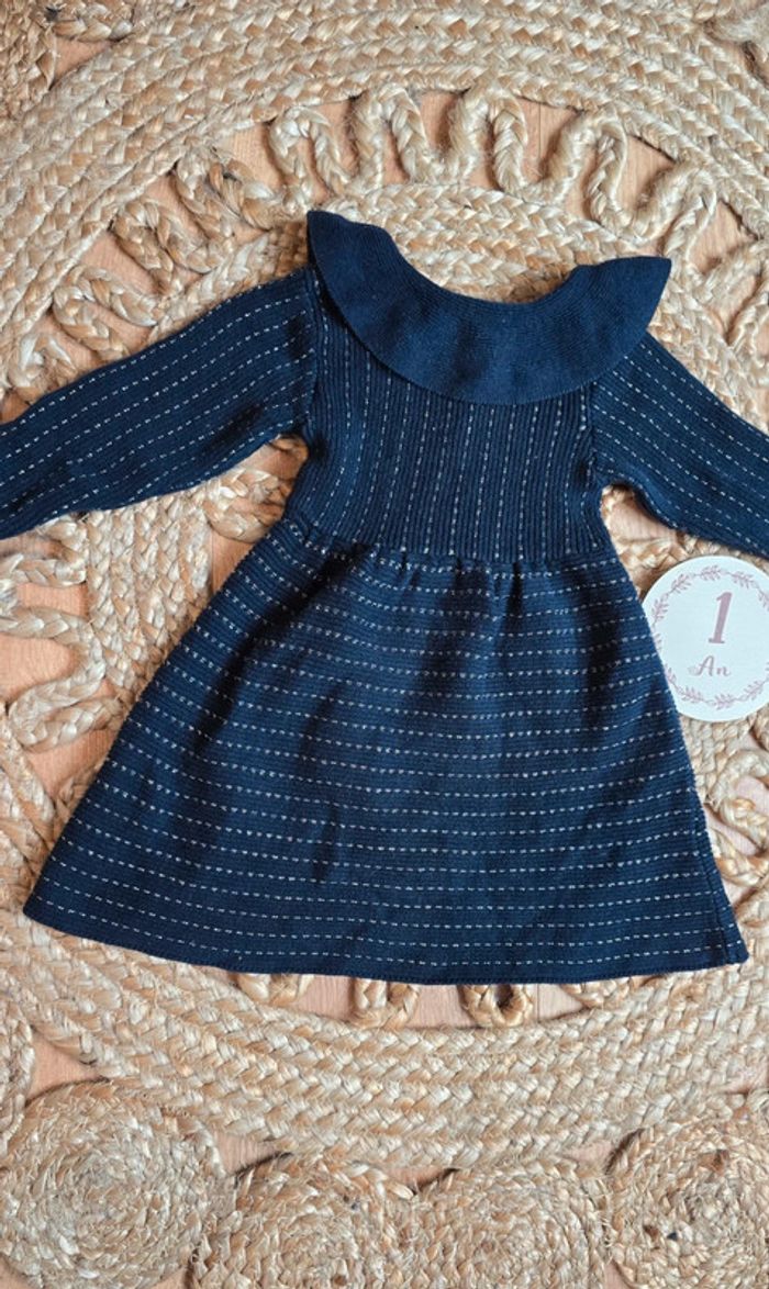 Robe Kiabi en maille bleu foncé à coutures fil argenté, col à volants, boutons au dos, taille 12 mois, très bon état #robe #bébé #lot #12mois