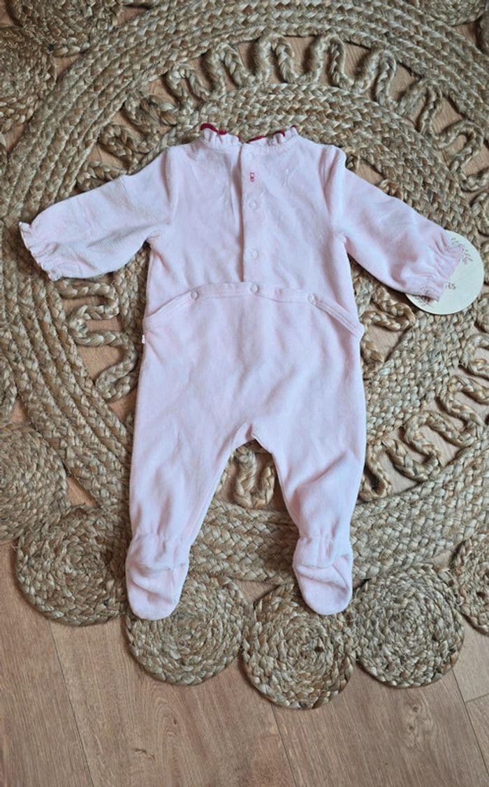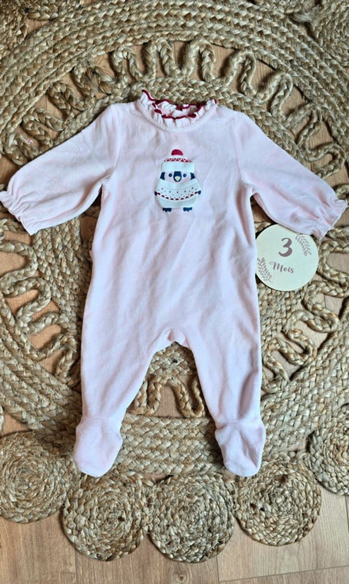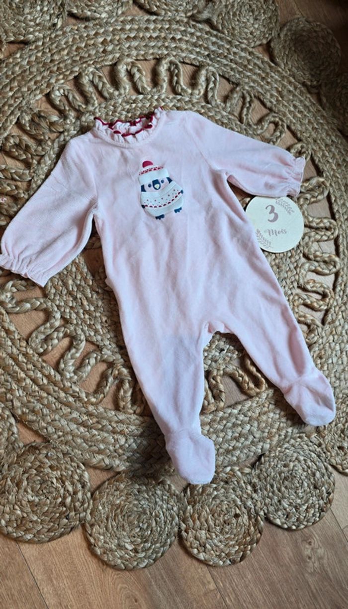 Pyjama grenouillère Obaibi velours rose pâle, détails volants, pingouin, pressions à l'arrière, taille 3 mois, mis une fois comme neuf #obaibi #okaidi #pyjama #grenouillère #bébé #bébéfille #lot #3mois