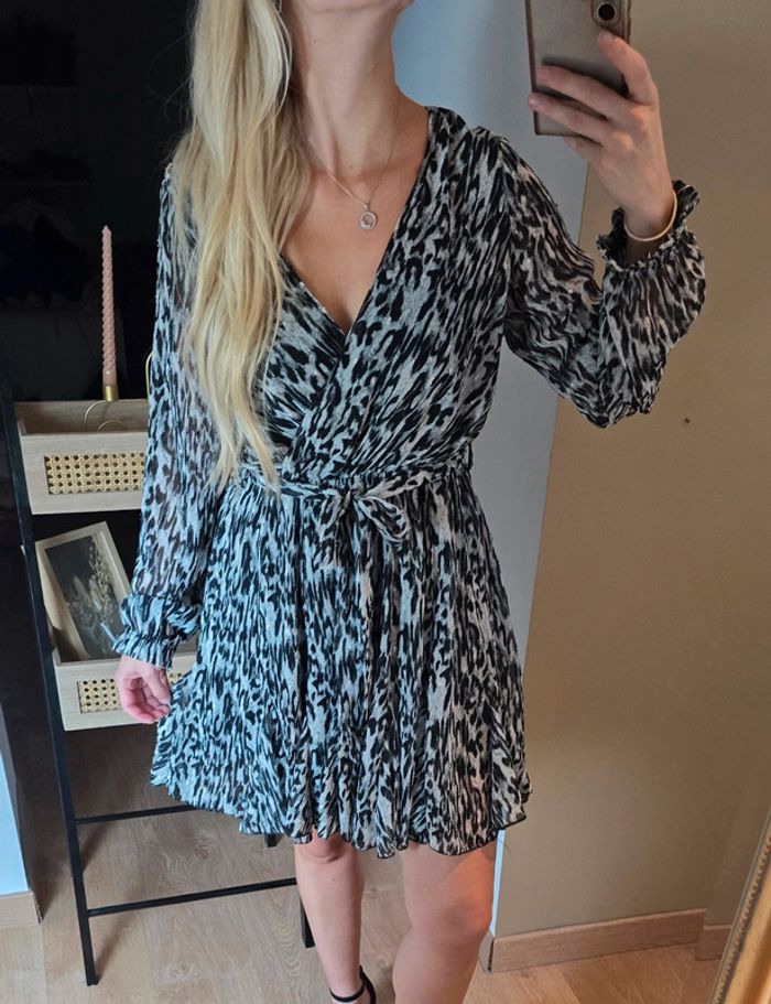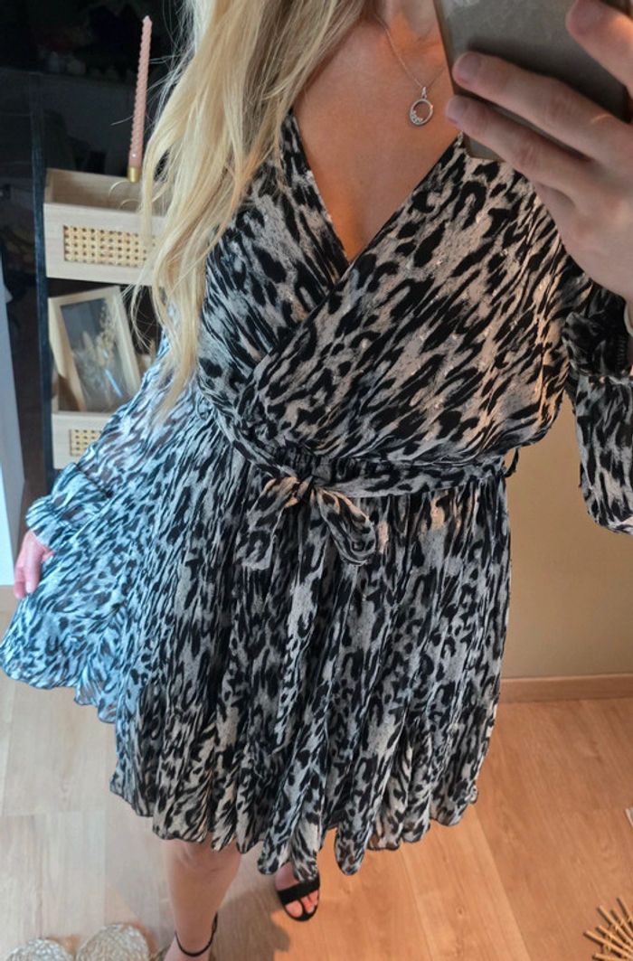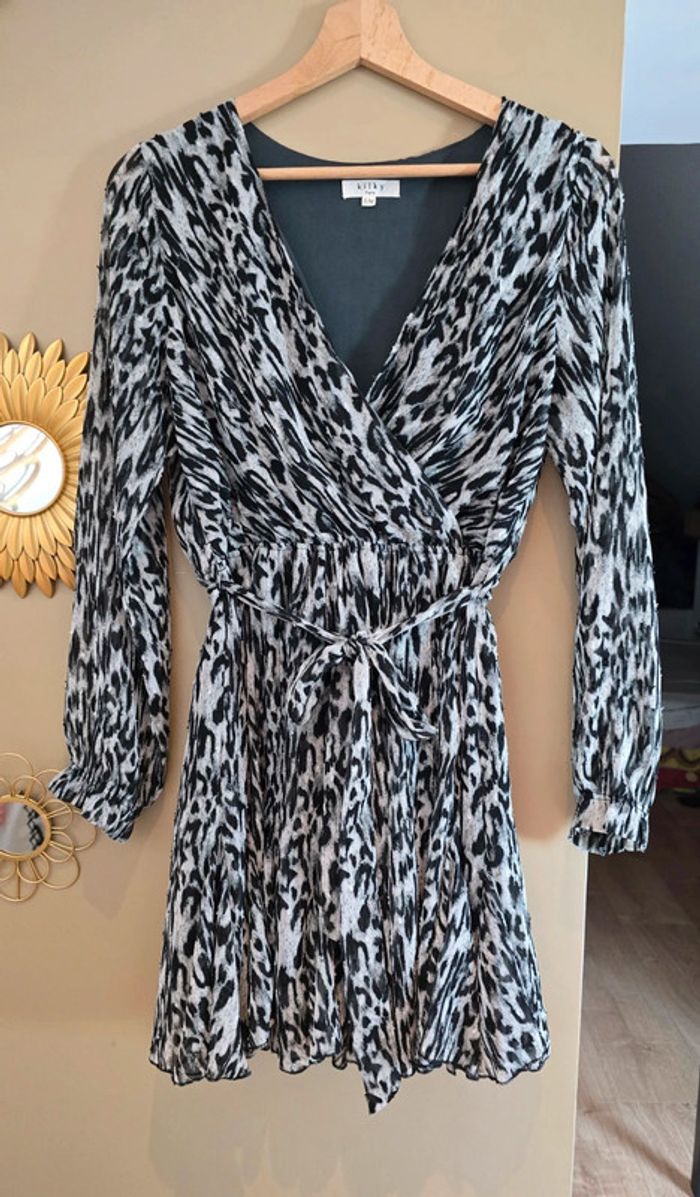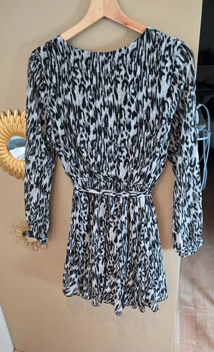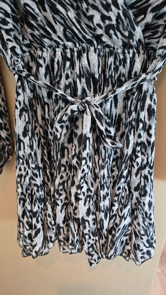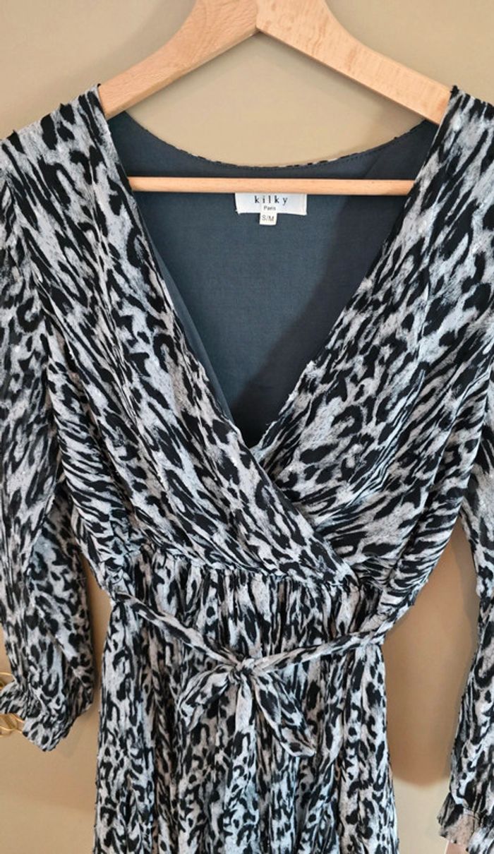 Robe Kilky imprimé léopard noir et blanc fil argenté, matière fluide, bas plissé, ceinture à nouer à la taille, taille S/M, très bon état #robe #kilibbi #femme #leopard #plumetis