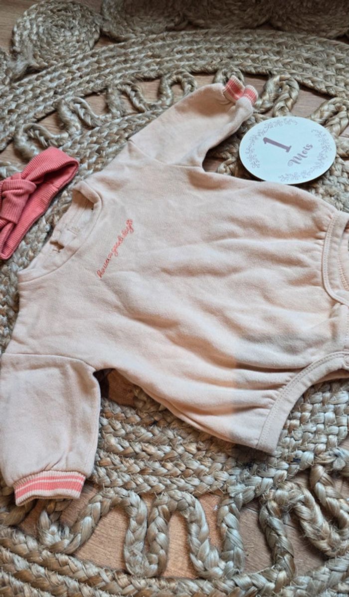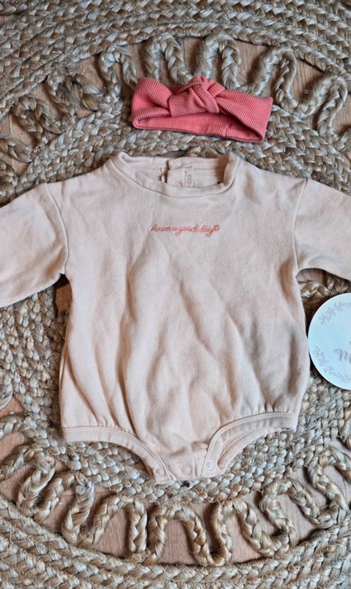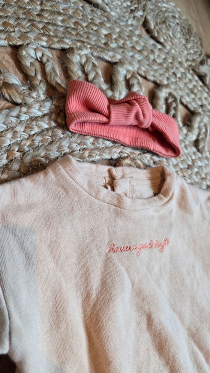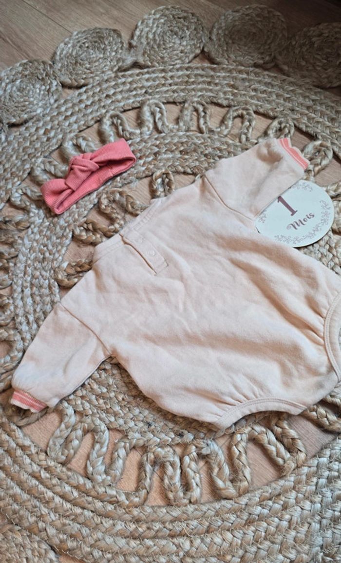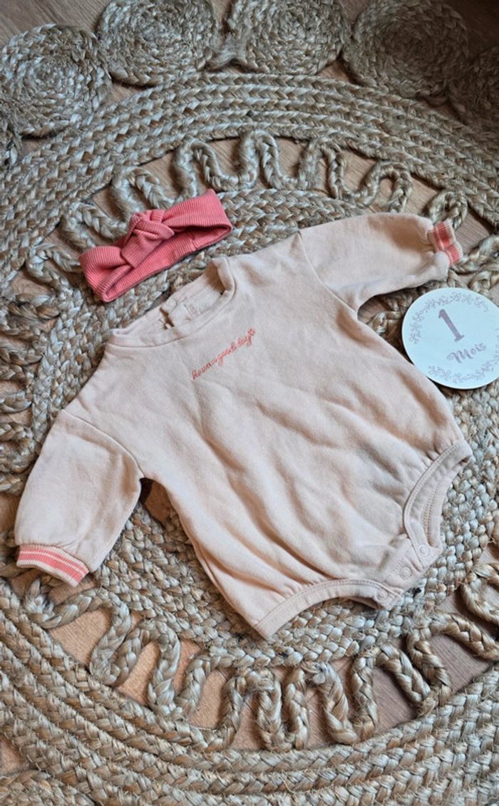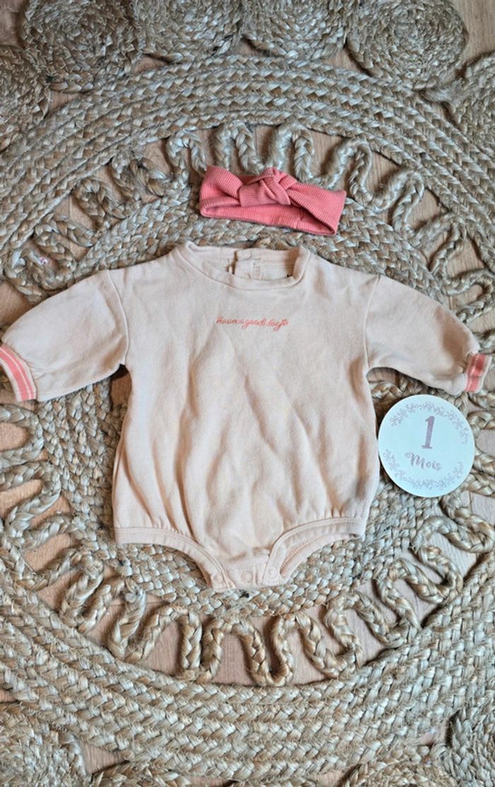 Ensemble barboteuse combinaison Kiabi couleur rose corail orangé, pressions sur le bas, bandeau assorti torsadé, taille 1 mois, mise une fois #kiabi #bandeau #bébé #lot #1mois #combinaison