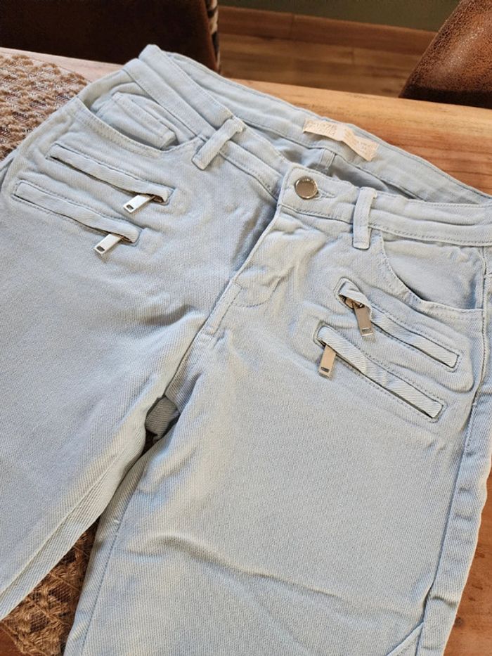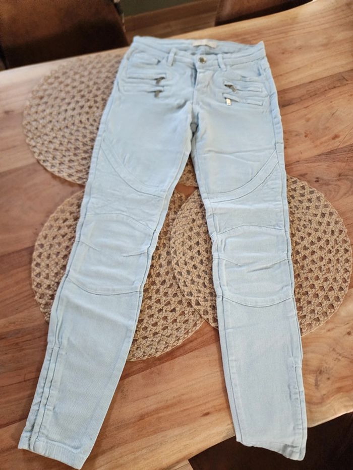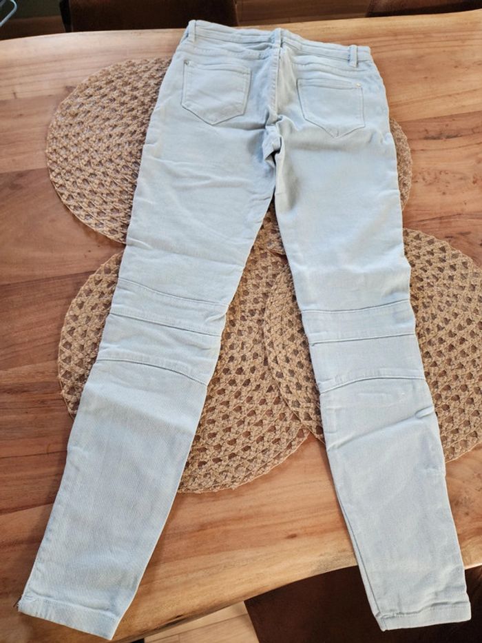 Jean Zara coupe slim couleur bleu clair, fermetures sur le devant, détails au genoux, taille 36, neuf #zara #jean #jeanslim #zarajean