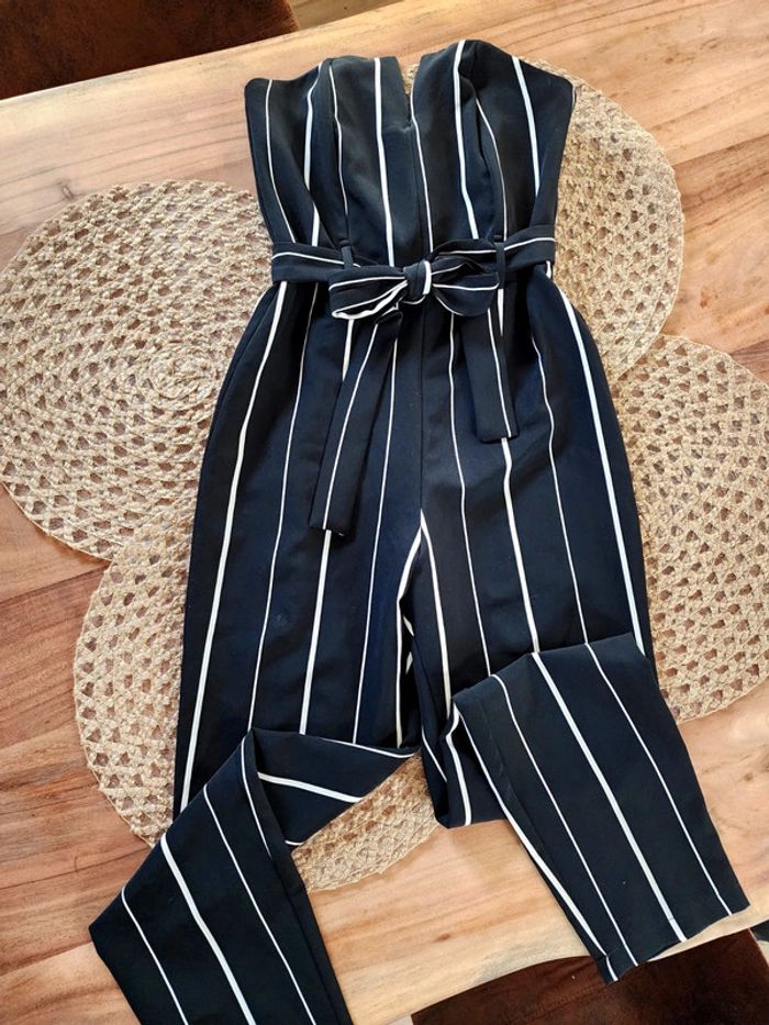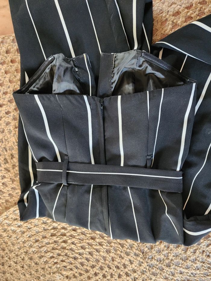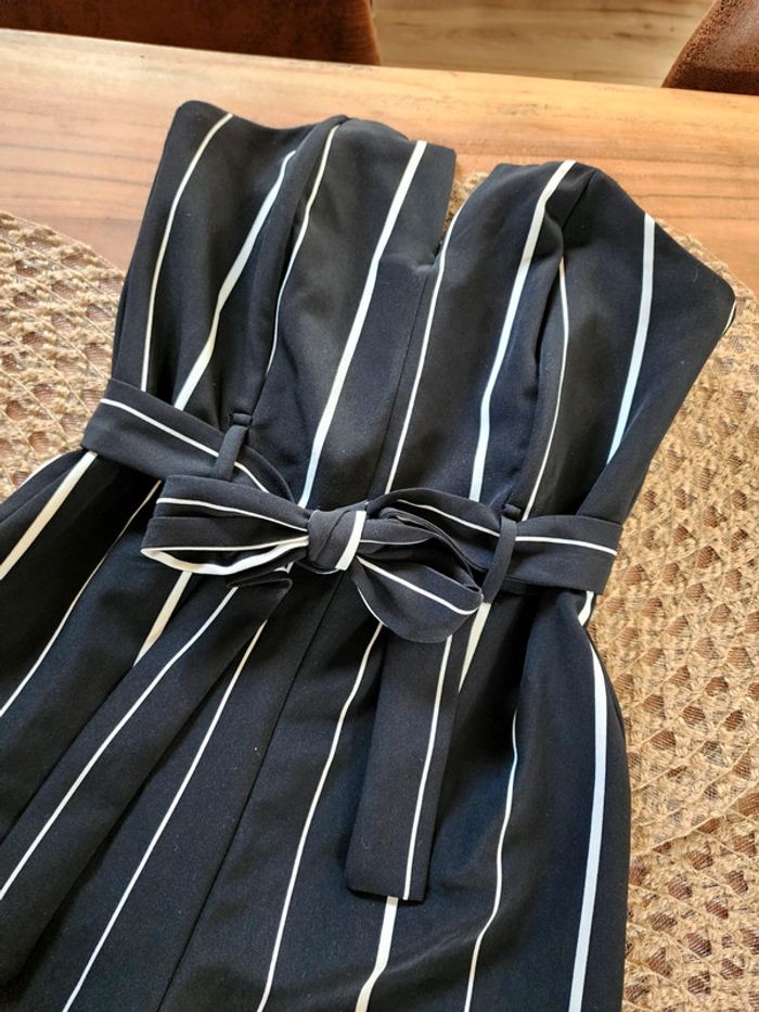 Combinaison rayé noir et blanche, coupe bustier, fente au décolleté, tiens bien car bande en silicone à l'intérieur du bustier, noué à la taille, fermeture dans le dos, taille 36, très bon état #combinaison #combi #rayures #bustier