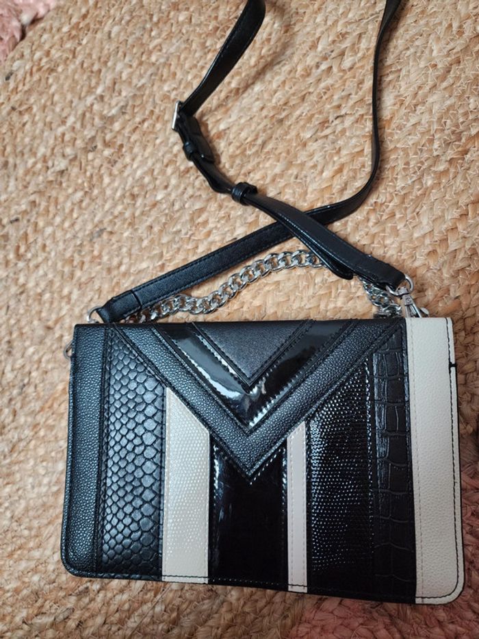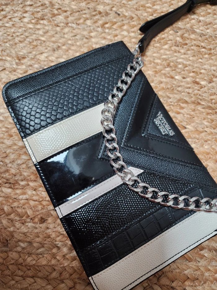 Sac Victoria's Secret bandoulière, couleur noir et blanc, différente effet de matière, reptile par endroit, chaîne argenté sur le devant mais possibilité de la glisser à l'intérieur, 3 pochettes à l'intérieur, 2 se ferme par pression et 1 par fermeture, bandoulière réglable, peu portée très bon état #victoriassecret #sac #vs