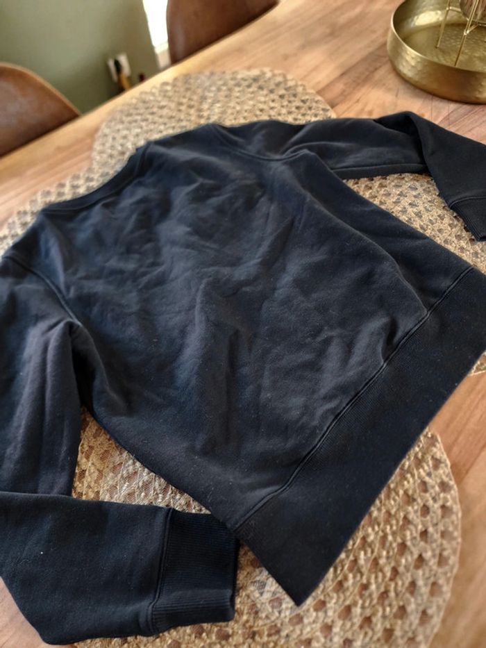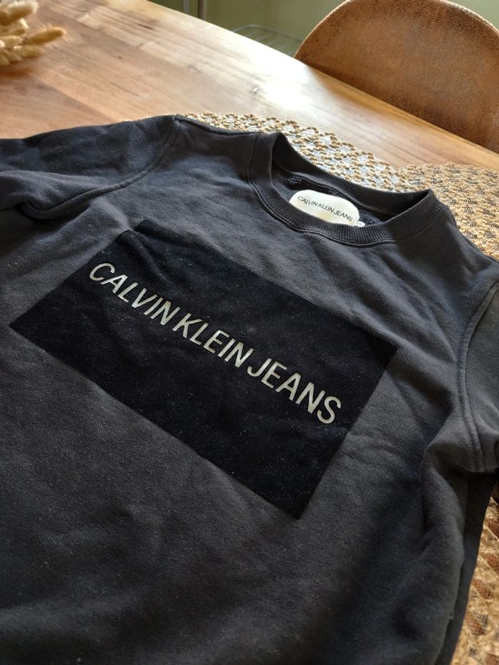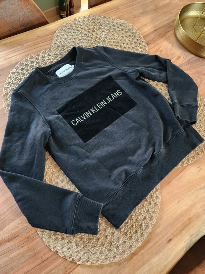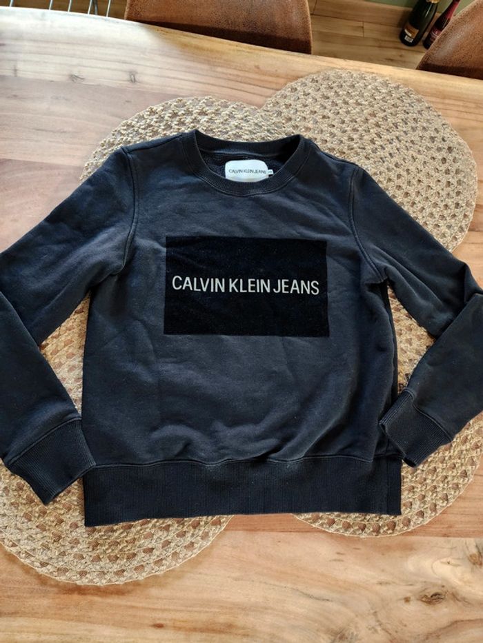 Sweat pull Calvin Klein noir, avec inscription de la marque sur le devant avec détails suédine, taille XS, peu portée, très bon état