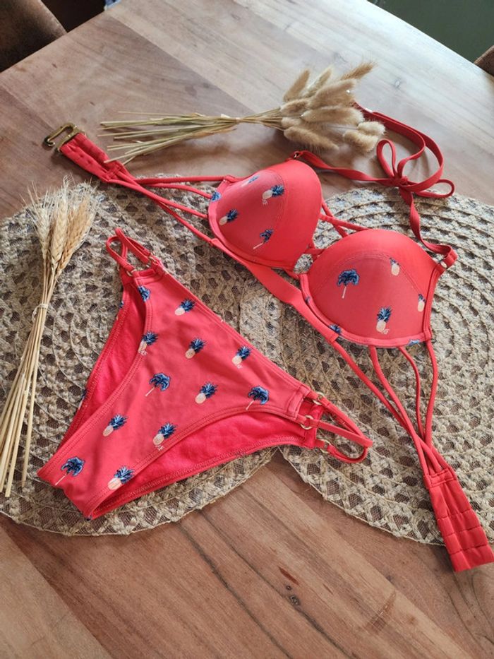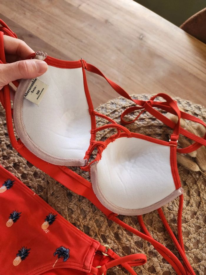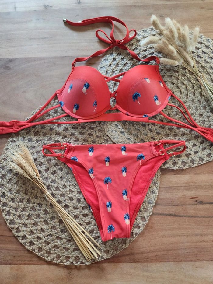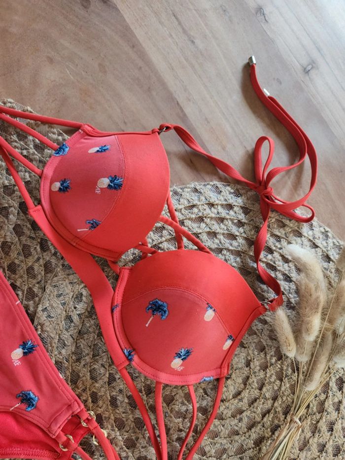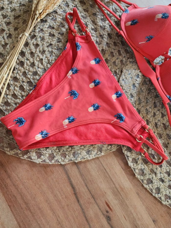 Maillot de bain Abercrombie & Fitch, deux pièces, couleur corail rouge, imprimé "AF" avec ananas, haut taille 34B convient à un bonnet B/C je fais un 85C, bas taille S, peu portée Valeur 65€ #abercrombie #abercrombieandfitch #bikiniset