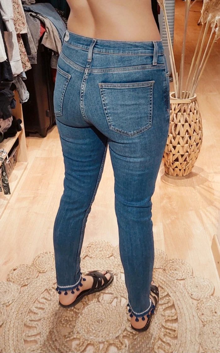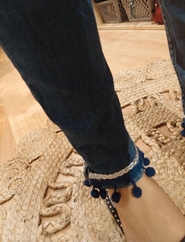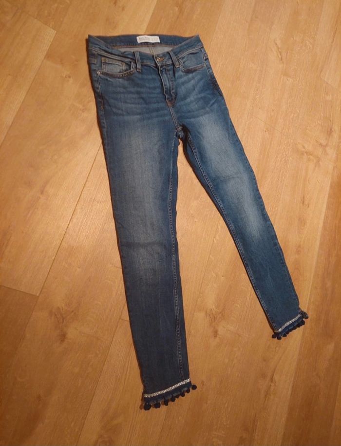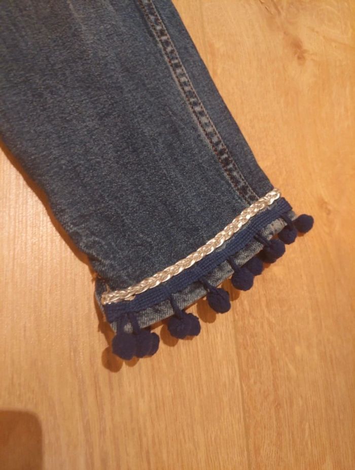 Jean slim Zara bleu, bandes argenté sur le bas avec pompons bleu foncé, taille 36, mis une fois #zara #jeans #pompons