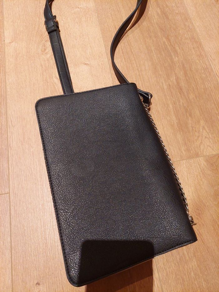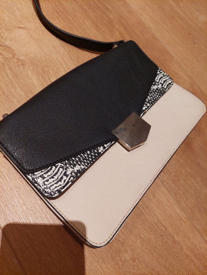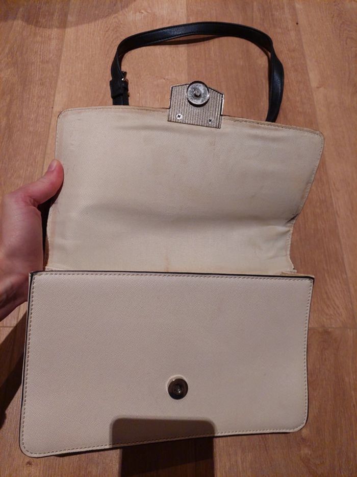 Sac bandoulière noir et beige, bandoulière réglable, fermeture par pression, boucle argenté présentant des rayures, intérieur taché #sac #bandoulière