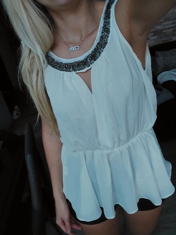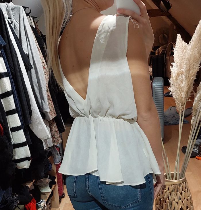 Haut blouse écru beige, détails perles sur le haut, dos nu croisé, bas évasé peplum, taille 36, neuf #haut #blouse #dosnu
