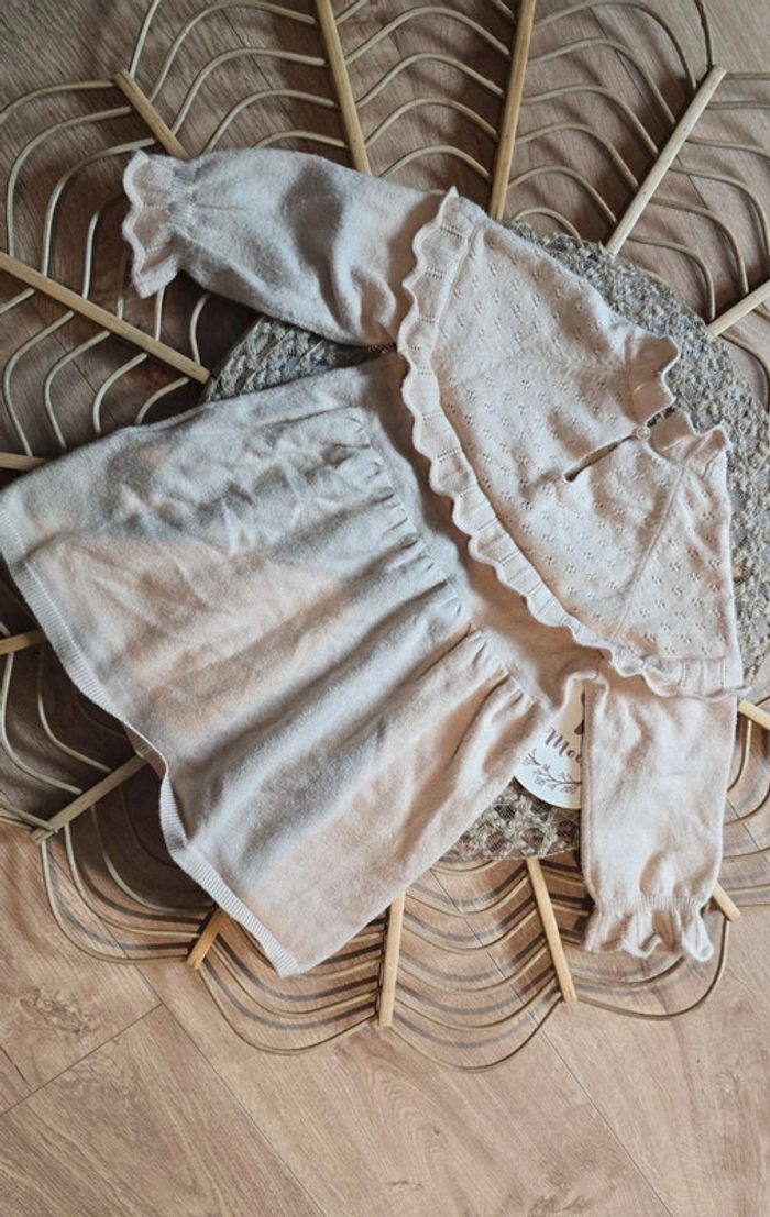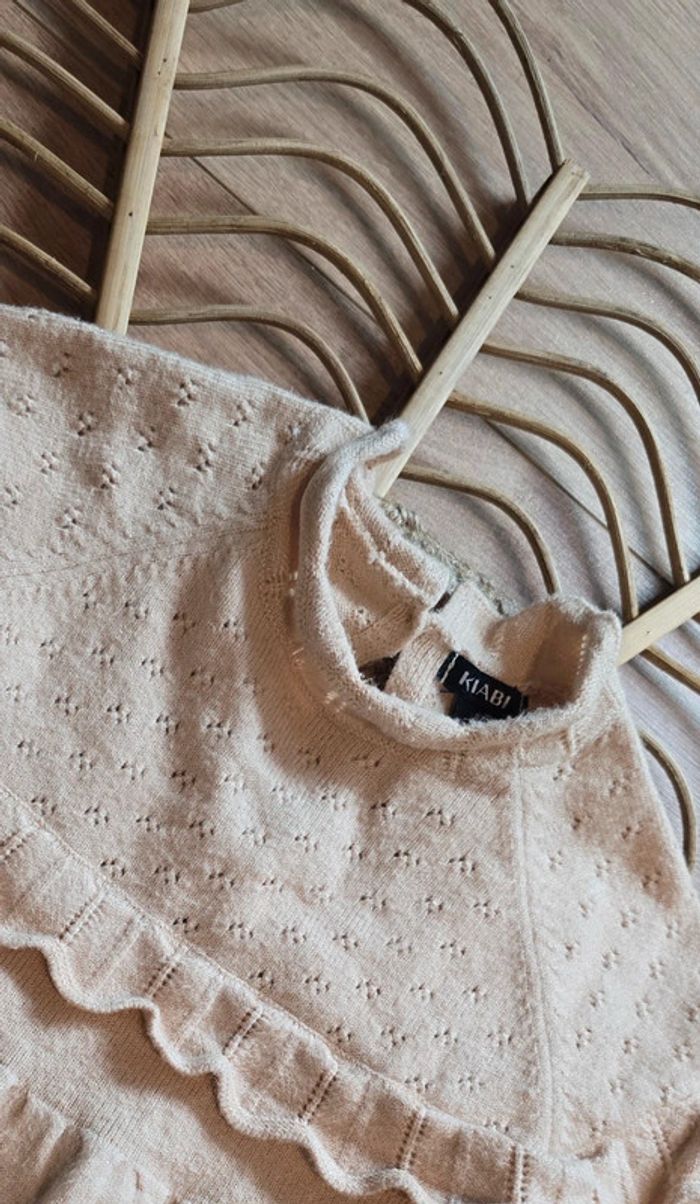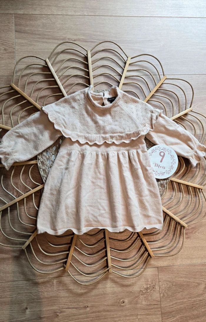 Robe Kiabi en maille pull beige, détails volants et dentelle sur le haut, bouton au dos, taille 9 mois, très bon état #kiabi #robe #bébé #lot