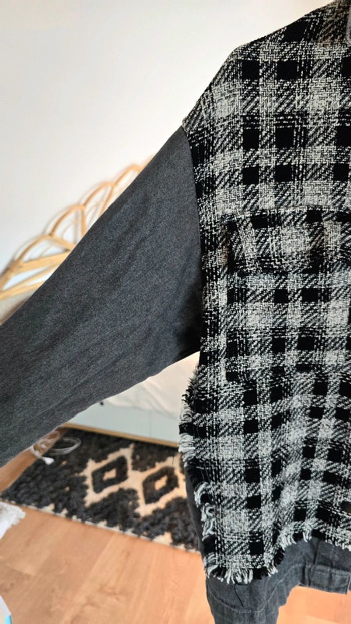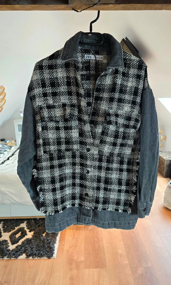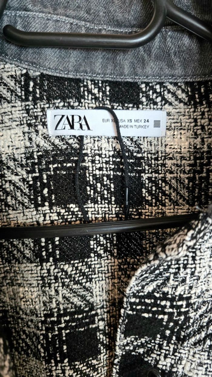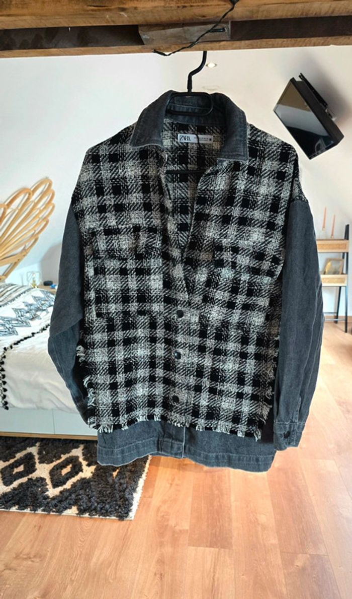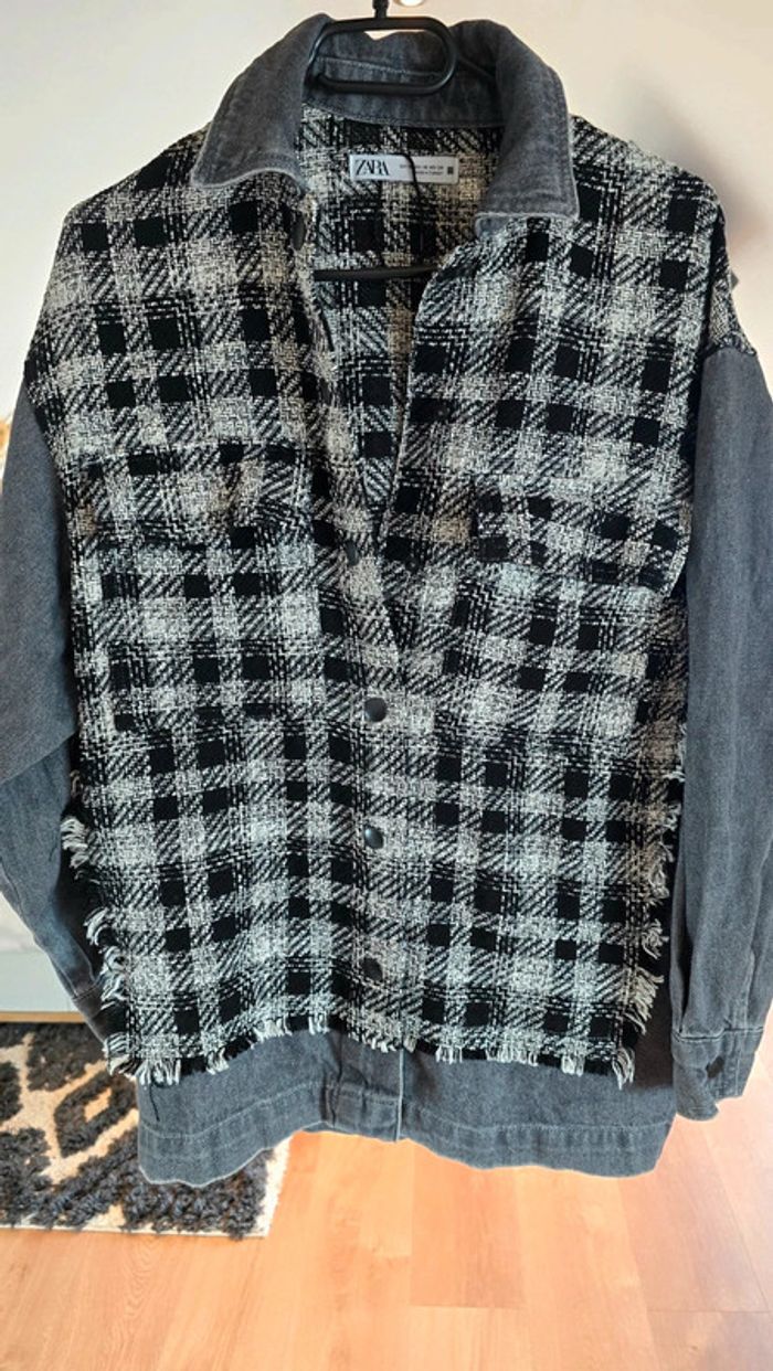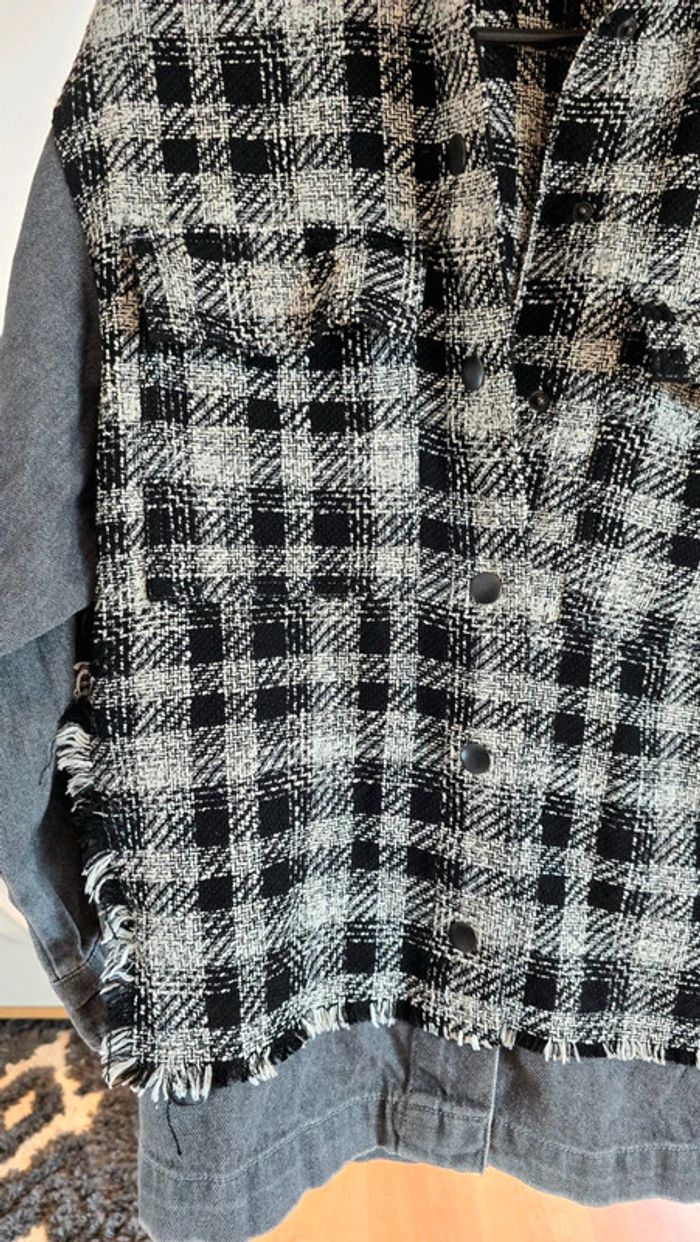 Veste Zara, jean gris foncé, tweed en carreaux noir et blanc, fermeture par pression, taille 34 XS, neuve #zara #veste #carreaux