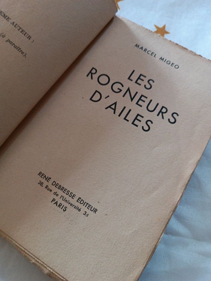Livre Book ancien rogneurs d'ailes para parachutiste avion aviation militaire marcel migeo debresse guerre témoignage 1940 L'auteur relate à vif les manques de l’Armée de l’Air durant la Drôle de guerre et la Bataille de France ( 1939 - 1940 ) Imprimé le 5 Juillet 1940 Oeuvre dédicacée par l'auteur lui-même et recouverte d'une couverture d'époque personnalisée avec une jolie peinture Voir les photos pour l'état