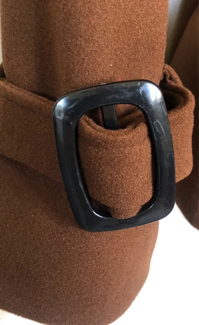 Veste courte feutrine Très belle qualité Coupe droite Neuve avec étiquette Fermeture croisée avec boutons et ceinture à nouer Poignets avec belle boucle chocolat à serrer Coloris marron 🤎 Taille L 100% polyester Doublure noire Made in Italy 🇮🇹 Largeur épaule 54cm Largeur sous aisselles 54cm Longueur 60cm