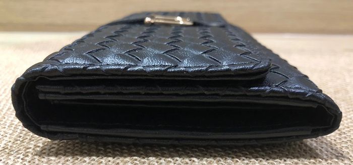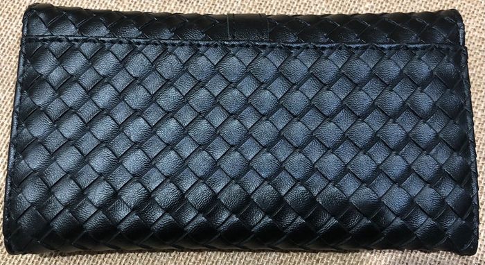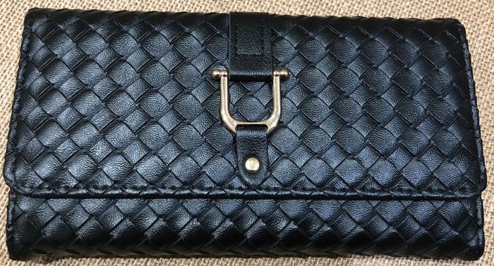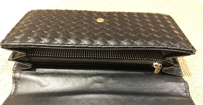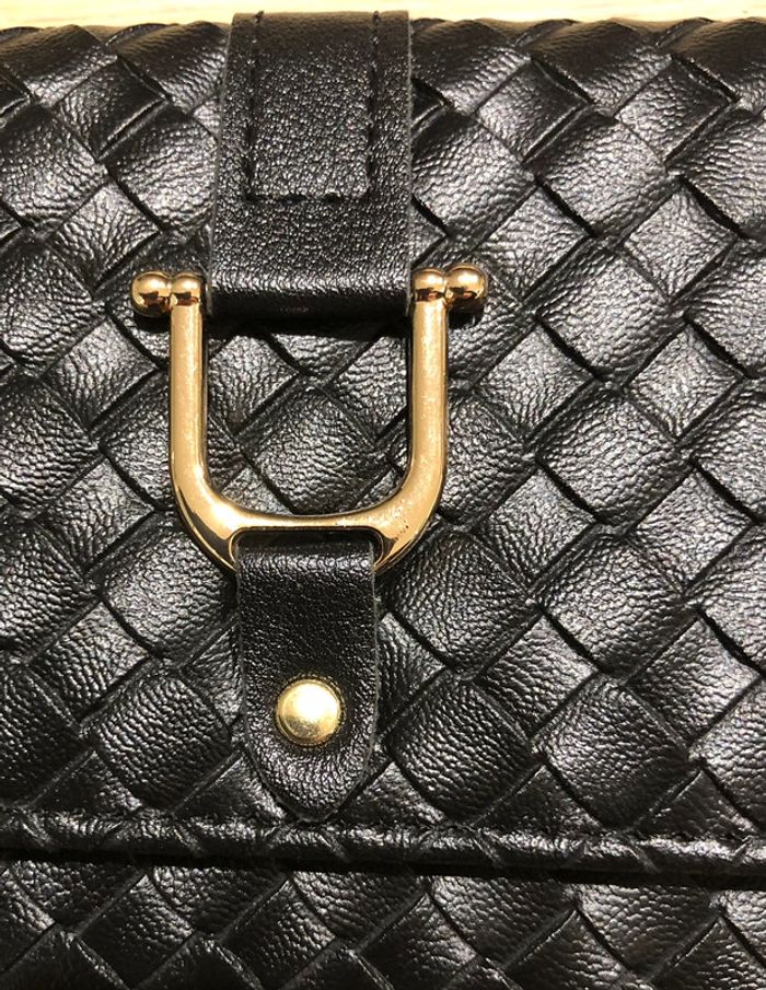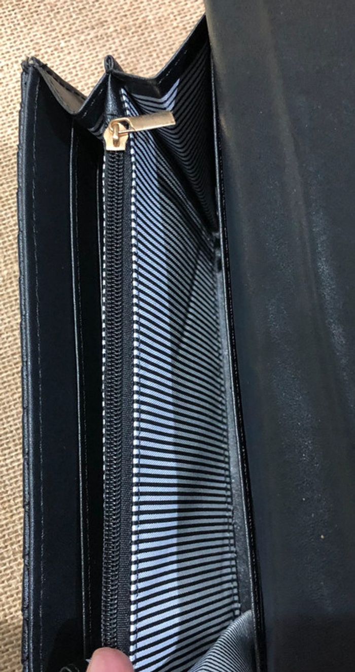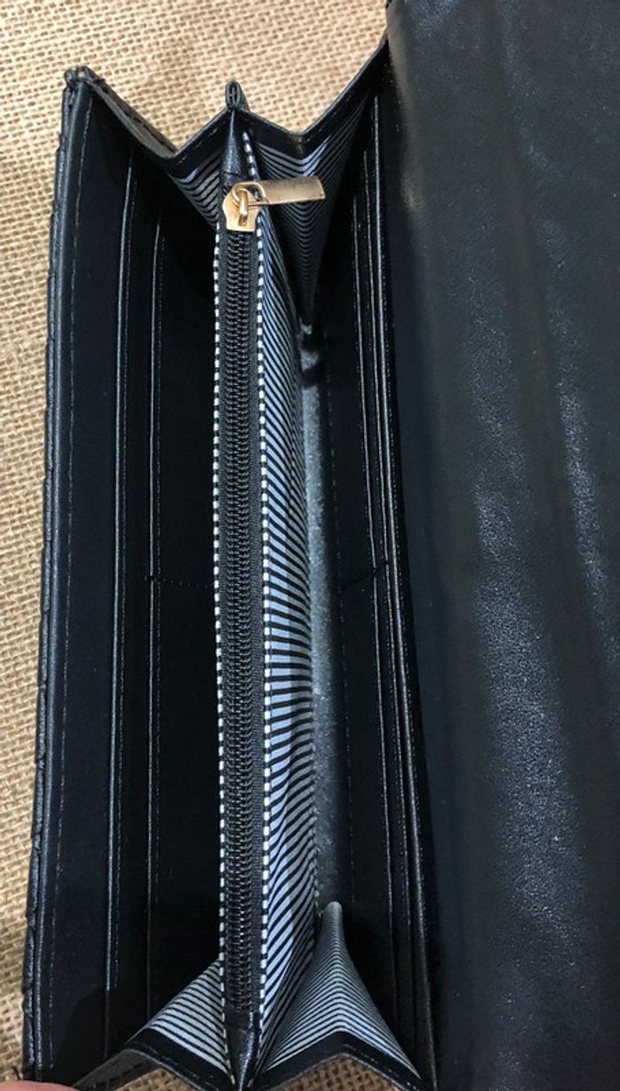 Très joli et grand portefeuille 💰💸 Rabat matelassé effet tressage damier fermeture par bouton pression 2 poches ouvertes 8 emplacements pour cartes 1 compartiment zippé pour la monnaie Intérieur rayé noir et blanc Dimension : 19 x 11 x 3 cm Coloris : noir Neuf - idéal pour un cadeau