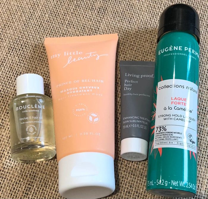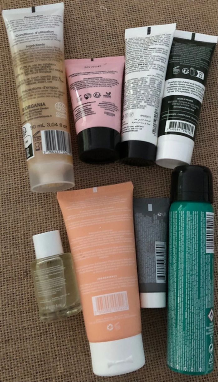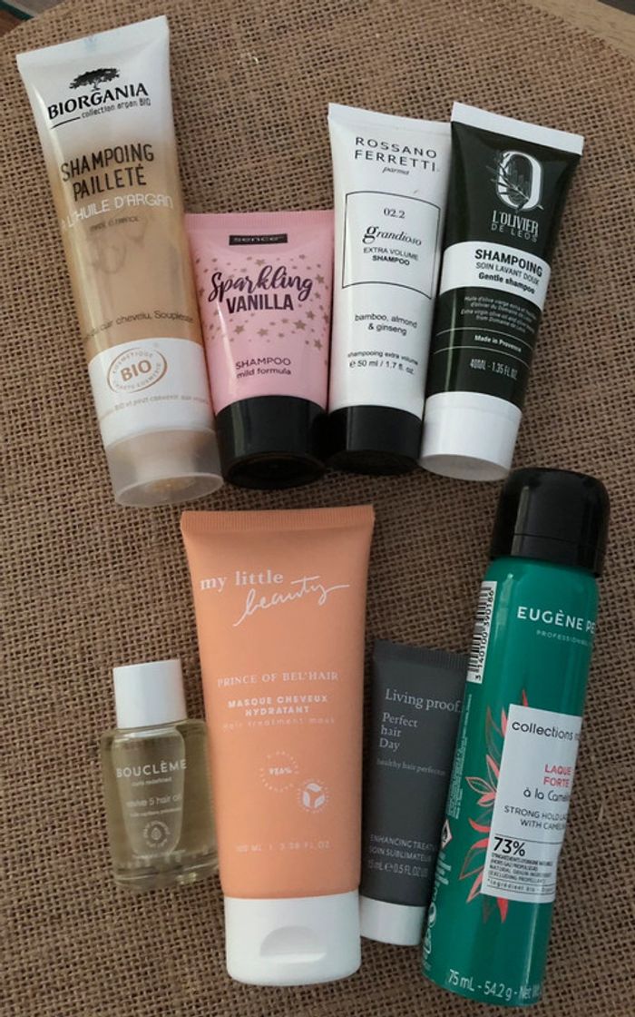4 shampooings : * Biorgania 90ml : souplesse et douceur - pailleté ✨à l'huile d'argan * Sence 30ml : vanille pétillante * Rossano Ferretti 50ml : Extra Volume - créatine, ginseng avocat 🥑 * L'Olivier De Léos marque Patrick Bruel 40ml : naturel et doux - huile d’olive 🫒vierge extra, hydrolat sauge 🌿et extrait de verveine 🍃 4 soins : * Bouclème 15ml : Huile capillaire Revive, purifiante, soignante et soyeuse - huiles de coco 🥥vierge, d'olive 🫒, de mongongo, de moringa et de graines de daïkon * My Little Beauty 100ml : masque hydratant et démêlant - amande douce & karité * Living Proof 15ml : soin sublimateur pour cheveux sains * Eugène Perma 75ml : laque forte à la caméline aux propriétés hydratantes et régénérantes certifiée Bio grâce à ses ingrédients naturels issus de l'agriculture biologique