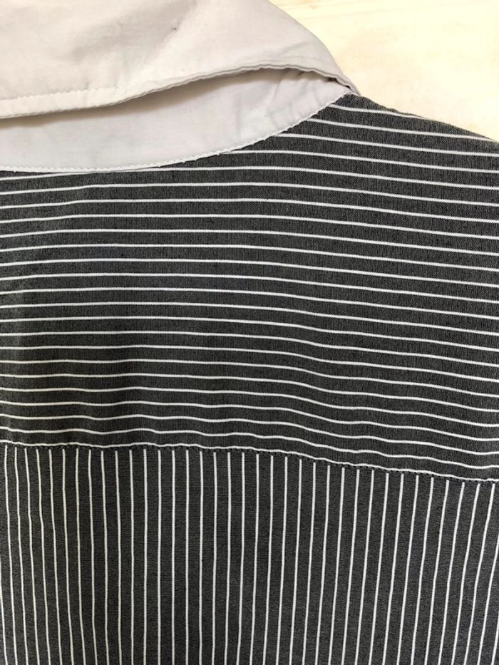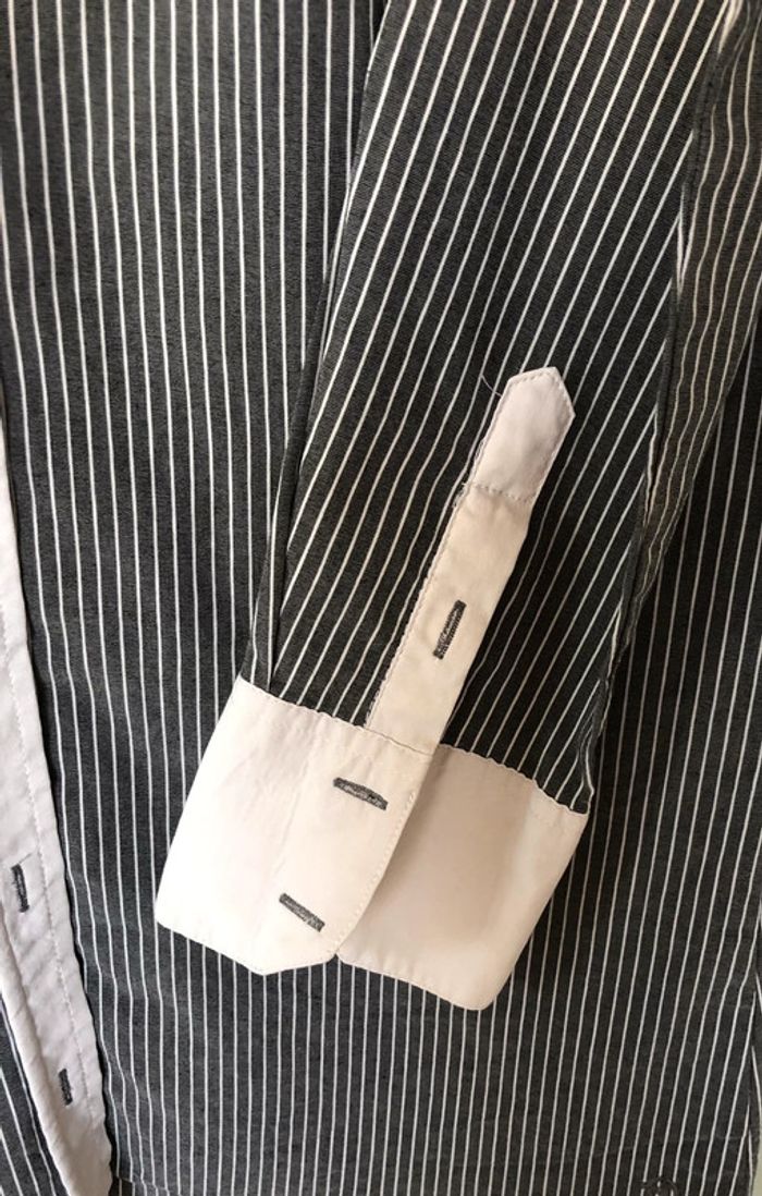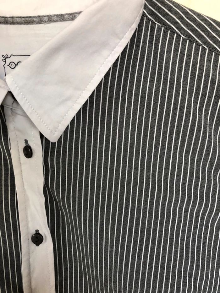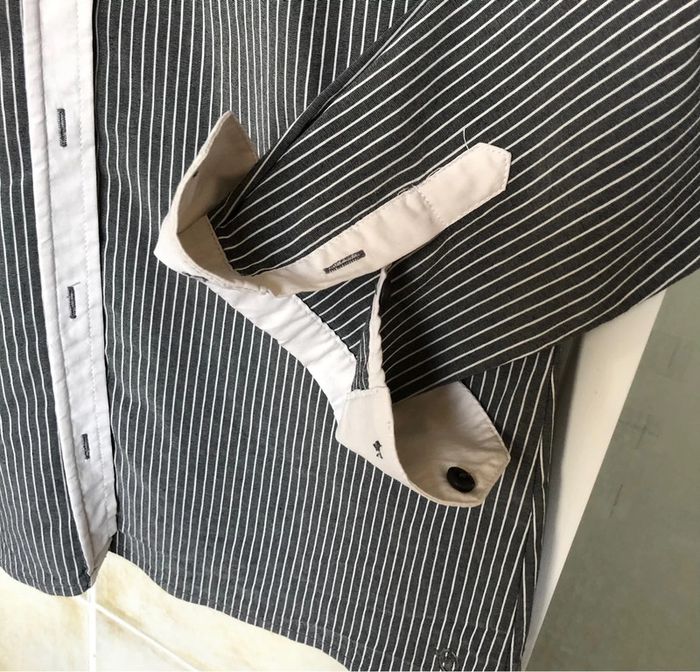 très belle chemise classe et/ou décontracte très bon état, peu portée coloris : gris souris / rayée blanc taille L marque : Bonobo 70% coton 27% polyester 3% elastane