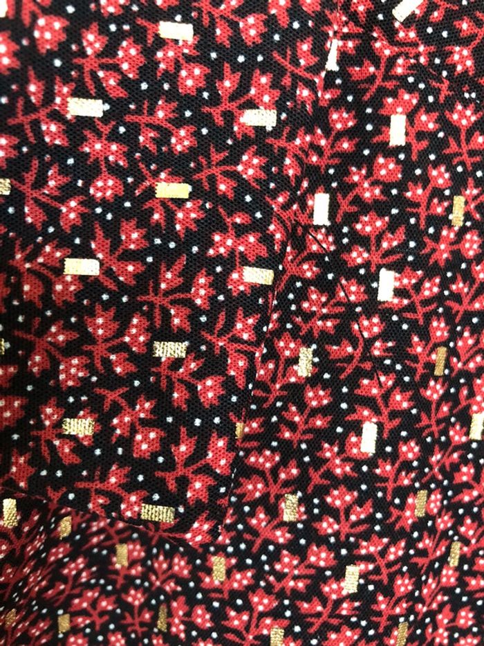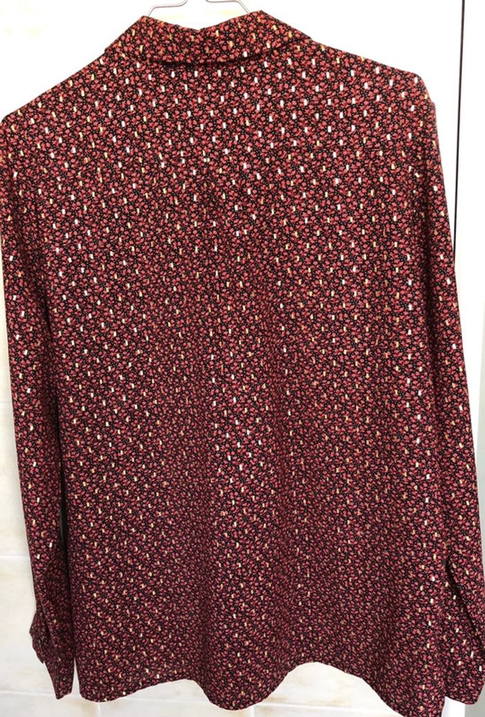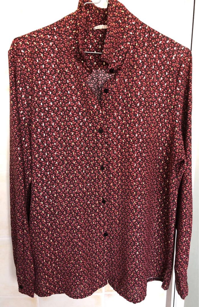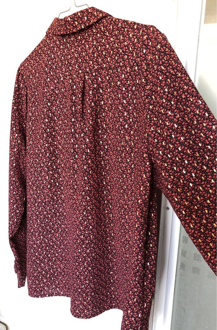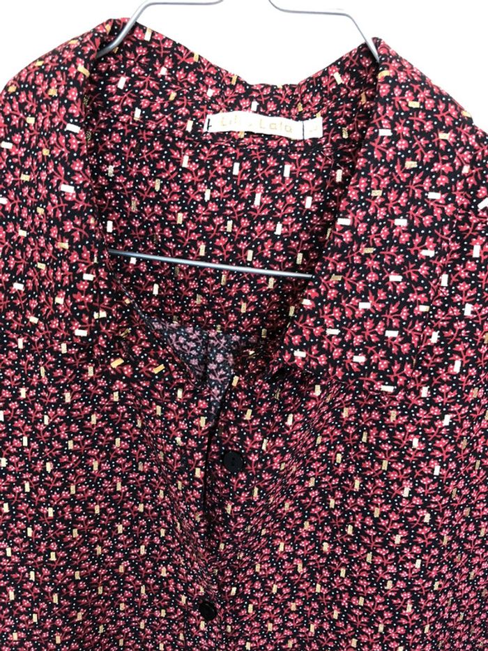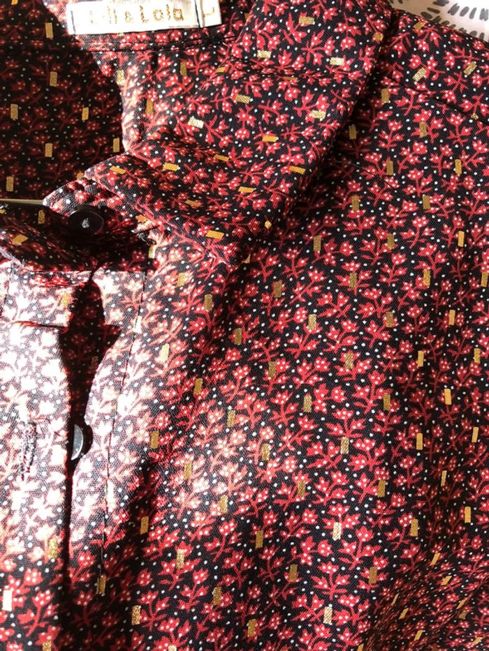 belle chemise très bon état, très peu portée coloris : fond noir / petites fleurs bordeaux / motifs dorés 100% polyester boutique indépendante taille L marque : Lili & Lala