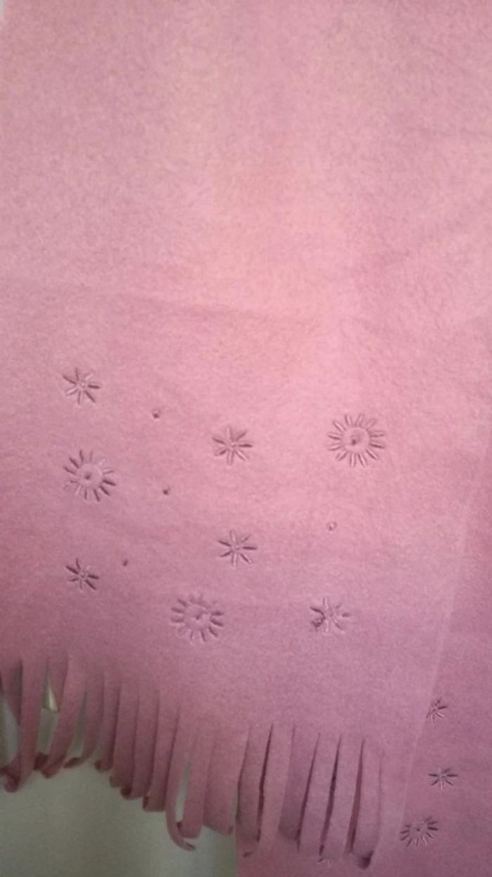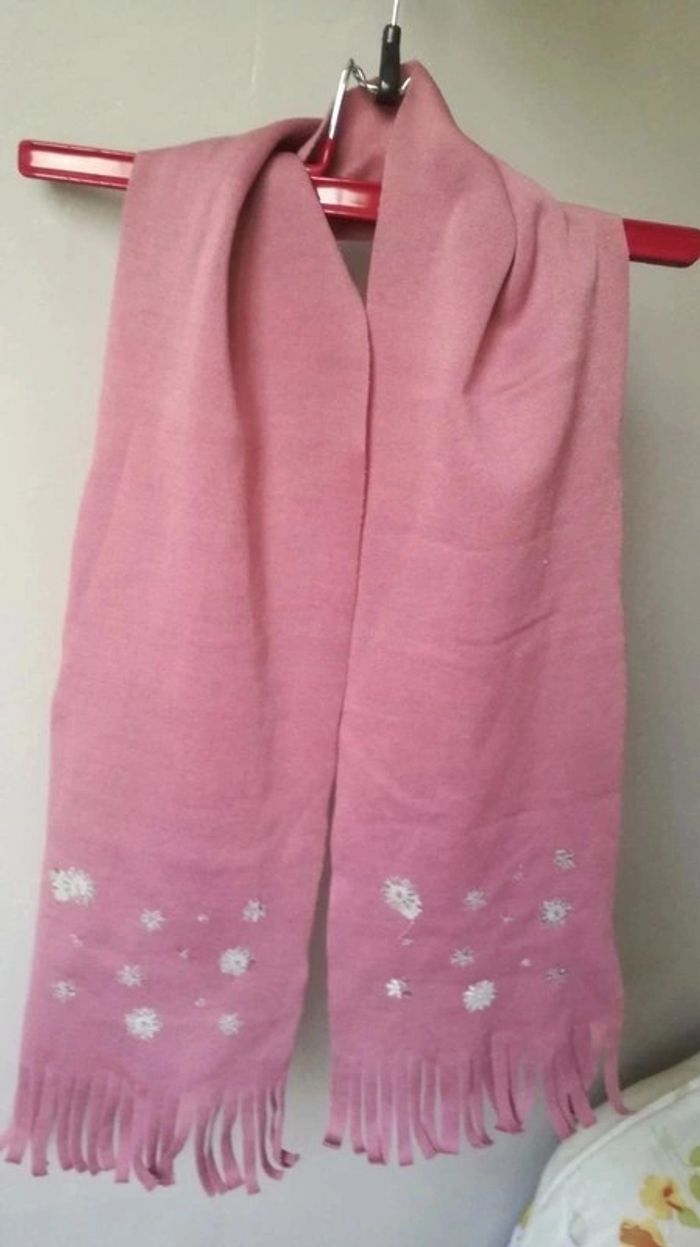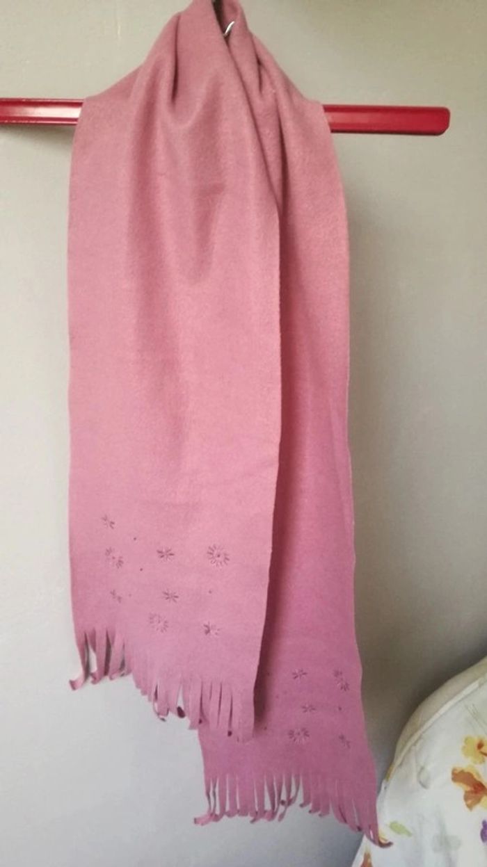 Écharpe polaire Très douce Coloris : rose poudrée & flocons blancs Dimensions : 1,50 x 0,20 cm Neuve - jamais portée Convient à une femme ou jeune fille