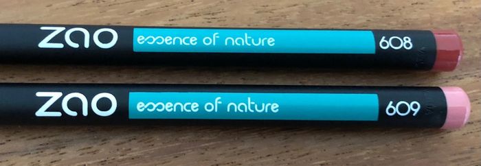 2 crayons lèvres certifiés ecocert, vegan et 100% naturel Teinte : 609 vieux rose / 608 brun orangé Format : 1.14g x 2 Marque : ZAO Essence of Nature
