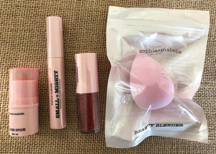 Marque : Sophia + Mabelle - beauté simple et universelle créée pour s'intégrer dans la collection de beauté de chacun, quelle que soit l'étape de sa vie. - Blush crème stick 5g teinte : Blossoming (orangé) touche de couleur à vos joues ou partout où elle est appliquée - Mascara extrême volume 7g Teinte : black - sous blister mascara volumateur pleine grandeur, recouvre les cils d'un volume léger et accumulable sans agglutiner, s'écailler ou tacher - Huile à lèvres teintée 7g teinte : Beach please - sous blister seule ou mélangée sur notre rouge à lèvres - Blender, éponge douce pour appliquer parfaitement votre maquillage pour un fini semblable à celui de la peau