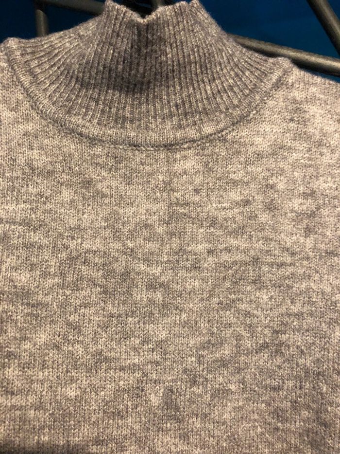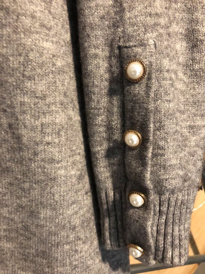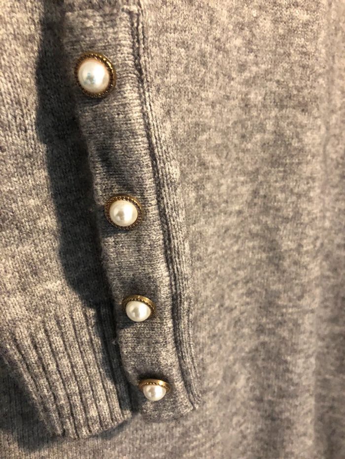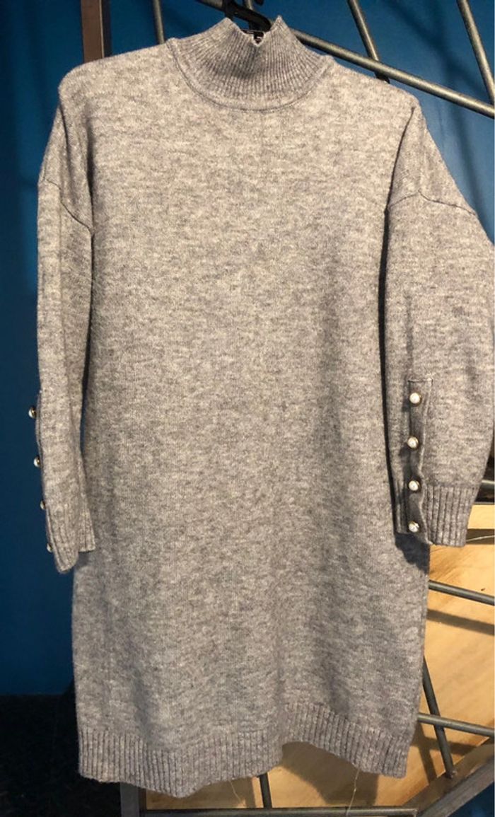 très belle robe col cheminée manches longues avec boutons blancs et dorés 43% acrylique 32% polyester 25% polyamide Coloris : gris chiné Taille : unique 40/42 Longueur 82cm Largeur épaules 56cm Largeur sous aisselles 57cm Marque : Belcci très bon état
