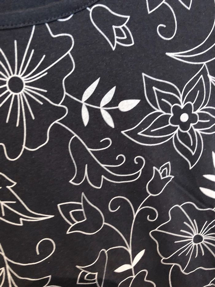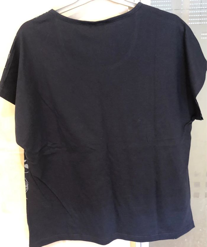 Tee shirt Coloris : marine / fleurs bleues claires 100 % coton Longueur 67cm Largeur sous aisselles 54cm Taille 42 Très bon état - peu porté