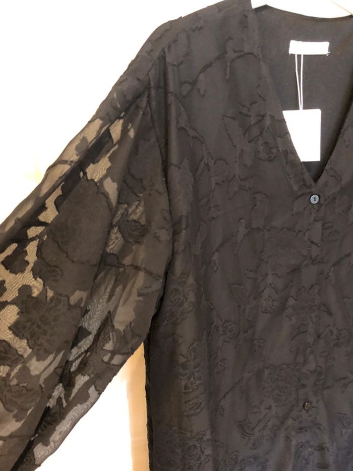 Très belle robe longue et chic Peut se porter avec une ceinture ou ouverte en veste longue En dentelle doublée Manches transparentes Ouverture devant avec boutons 100% polyester Taille 42 Longueur 1,25 m Largeur sous aisselles 49cm