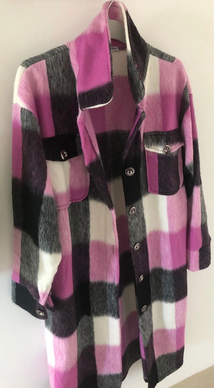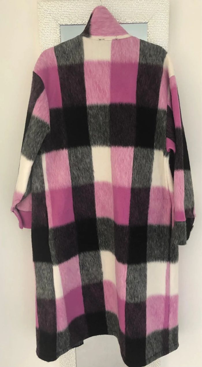 Très beau manteau long Look class ou décontracté 85% polyester 15% acrylique Taille unique 40/42 Longueur 110cm Largeur sous aisselles 55cm Motifs carreaux noirs roses beiges Marque New Collection Made in Italie 🇮🇹 Neuf jamais porté