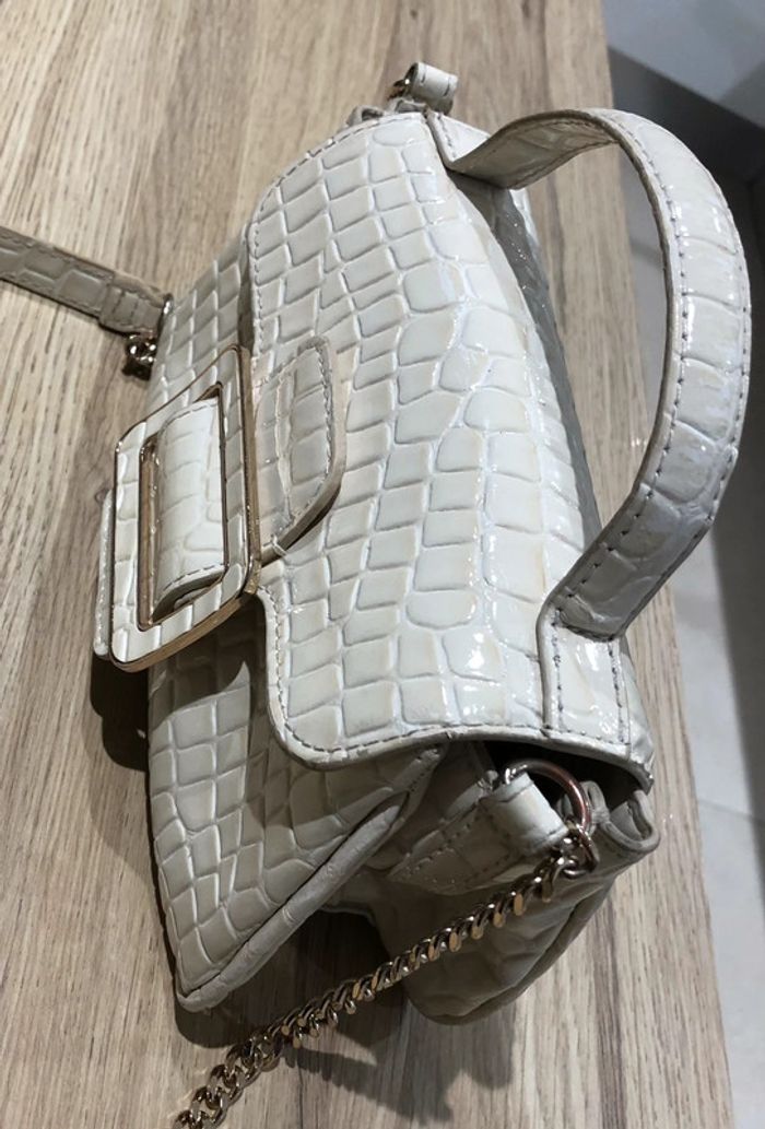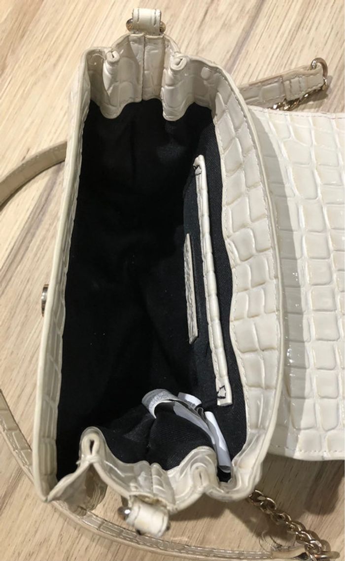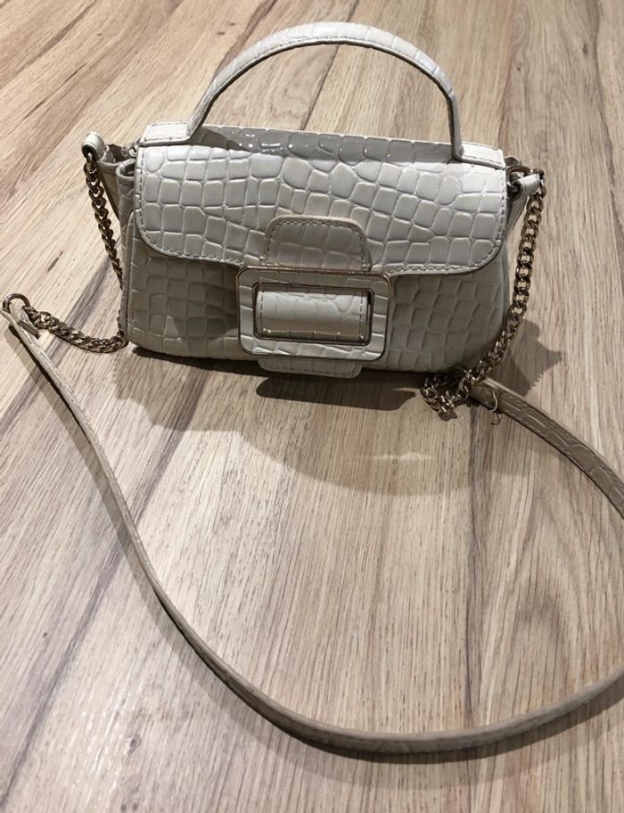 Petit sac / pochette Bandoulière mi chaîne dorée /mi plastique Coloris : beige crème Dimension 22 x 13 x 6 cm Extérieur 100% polyuréthane Intérieur doublure noire 100% polyester Porté bon état