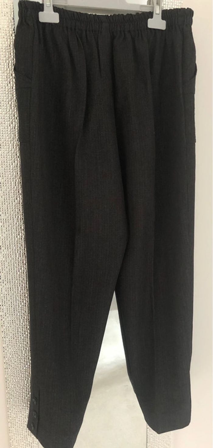 Très beau pantalon à pinces 2 poches Taille élastique Coloris : noir anthracite chiné 65% polyester 30% catronic 5% elastane Fente et boutons en bas de jambe Taille 4 / XXL/ 46 Tour de taille 86 cm Longueur 97cm Longueur entrejambe 68cm