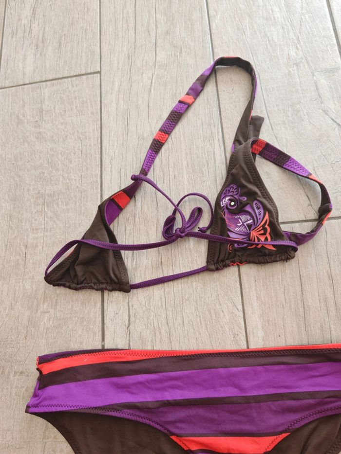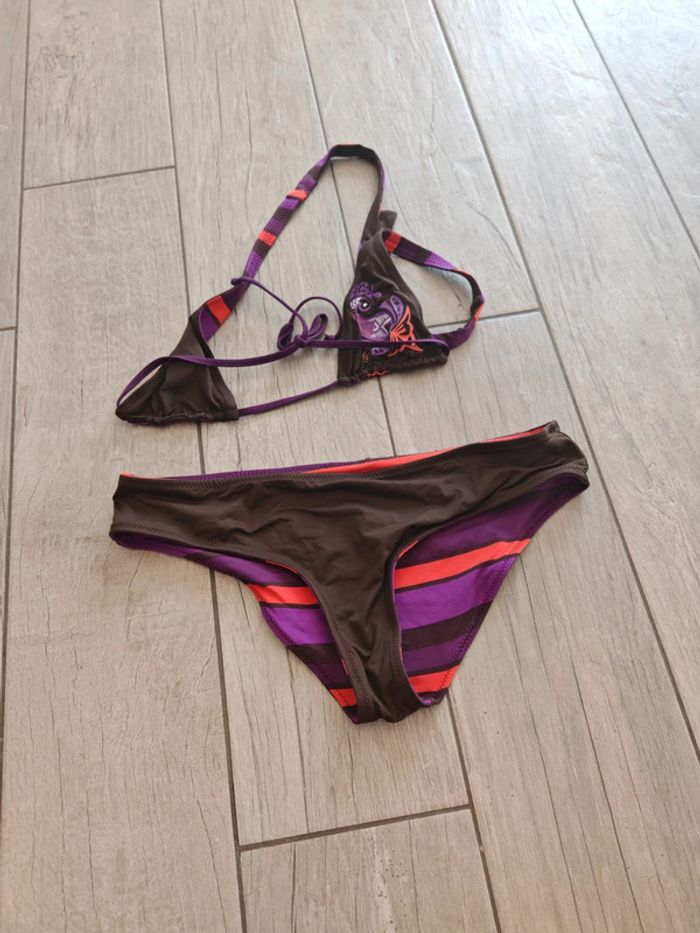 Maillot de bain 2 pièces réversible composé d'une culotte et d'un soutien-gorge triangle réglable Brun à motif fushia et orange Étiquette coupée