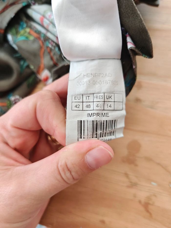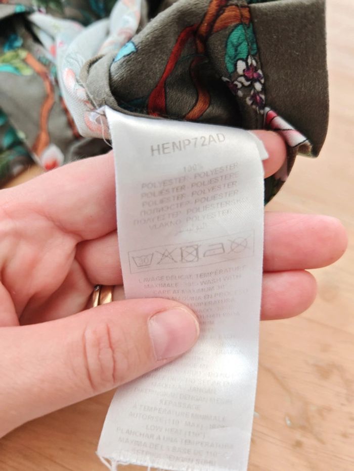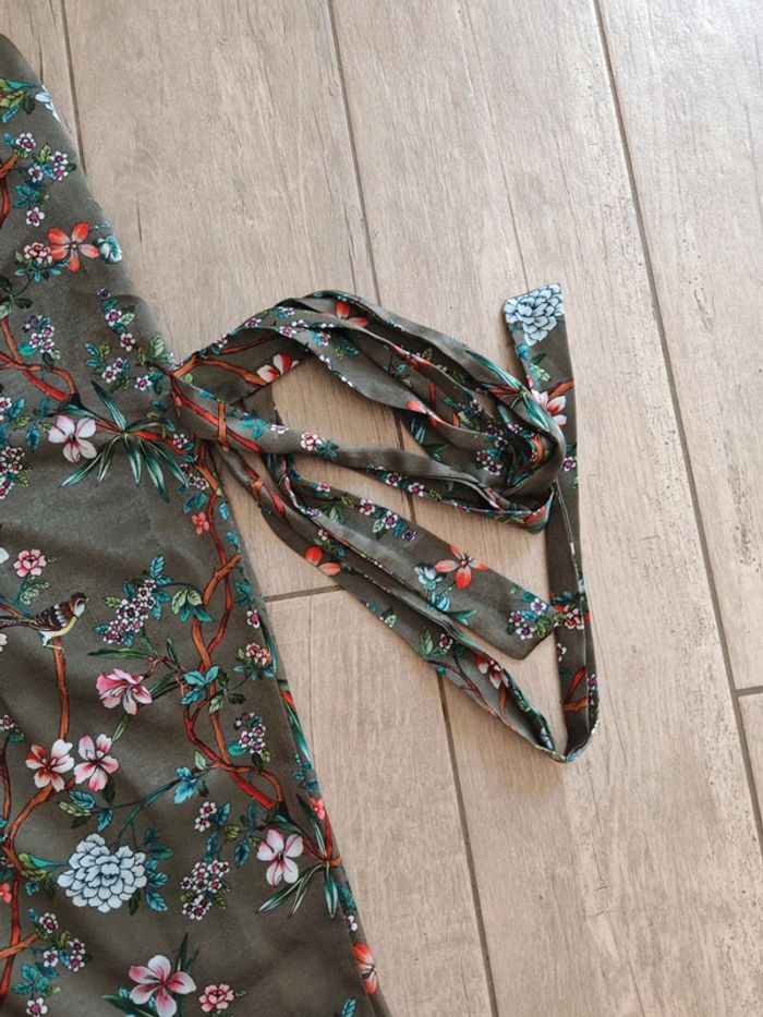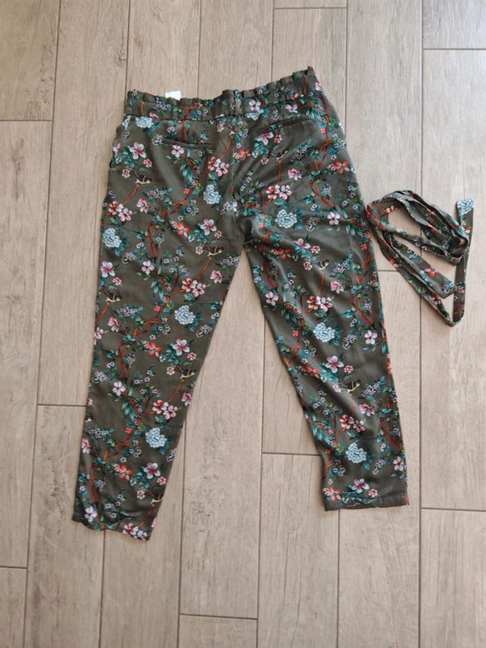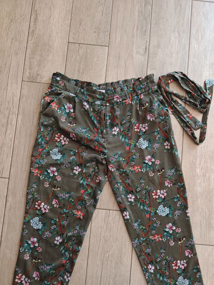 Pantalon fluide en polyester, kaki avec des motifs de fleurs. Fausses poches à l'arrière. Agréable à porter. Avec sa ceinture Naf-Naf taille 44