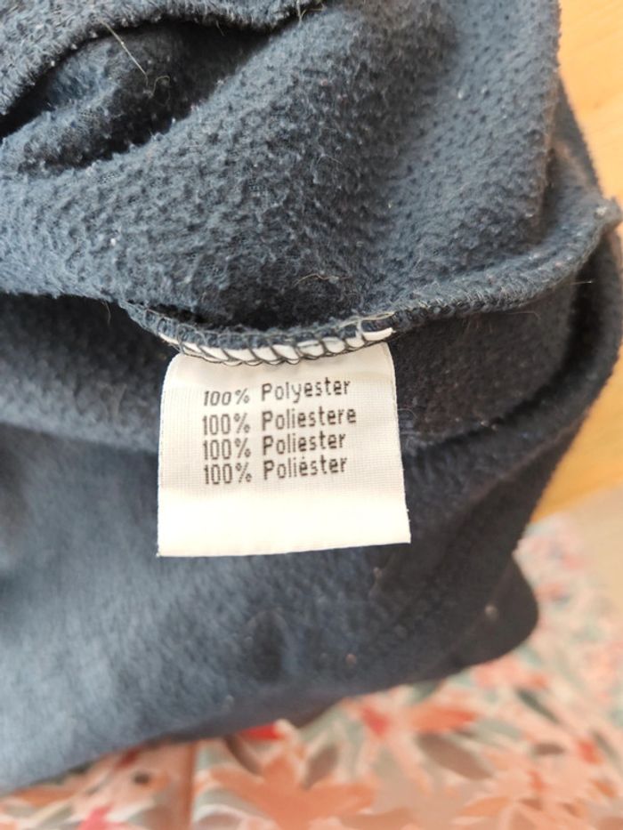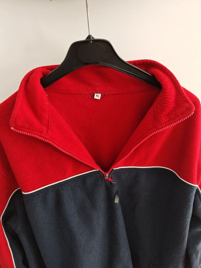 Pull polaire bleu marine et rouge, avec col et poches latérales. Mixte. Taille XL
