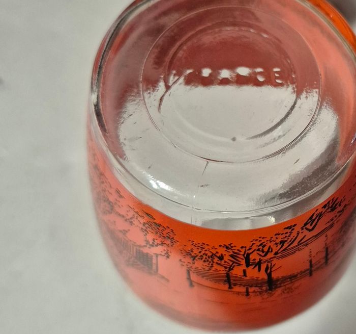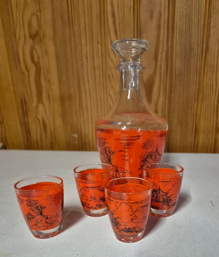 Très joli service à liqueur vintage composé d’une carafe avec bouchon en verre et de ses 4 verres assortis. Ensemble en verre transparent orné de magnifiques scènes asiatiques de type pagodes, paysages et arbres, en décor noir sur fond rouge orangé (liquide coloré non inclus). Estampe France sous le dessous très bon état (pas d’éclats, ni de fêlures) Décor typique des années 50/60 Hauteur de la carafe : environ 20 cm Hauteur des verres : environ 6,5 cm Idéal pour collection, décoration ou usage en service à digestif / apéritif #serviceàliqueur #verrevintage #carafeancienne #décorationvintage #verresanciens #verreillustré #vaisselleancienne #vintagehome #brocanteenligne #artdelatable #collectionverre #années50 #années60 #verreasiatique #stylevintage