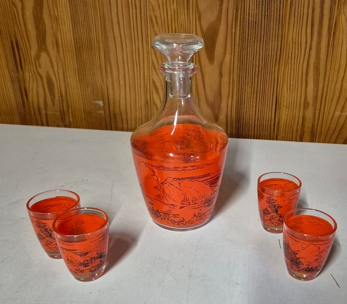 Ancien service à liqueur en verre décoré carafe et 4 verres scènes asiatiques - photo numéro 1