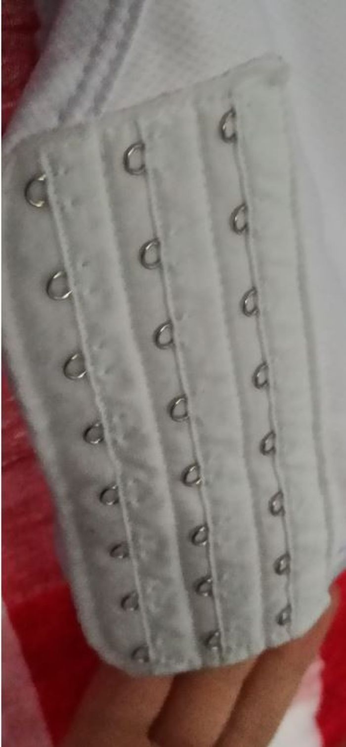 Brassière blanche avec 3 positions de crochets sur le coté (+ pratique que dans le dos) Idéal pour le sport, sans armatures Lavée et testée 1 fois par ma fille (trop petit pour elle) Taille indiquée M - Convient pour un tour de poitrine entre 70 et 75 cm (grâce aux 3 positions de fermeture)