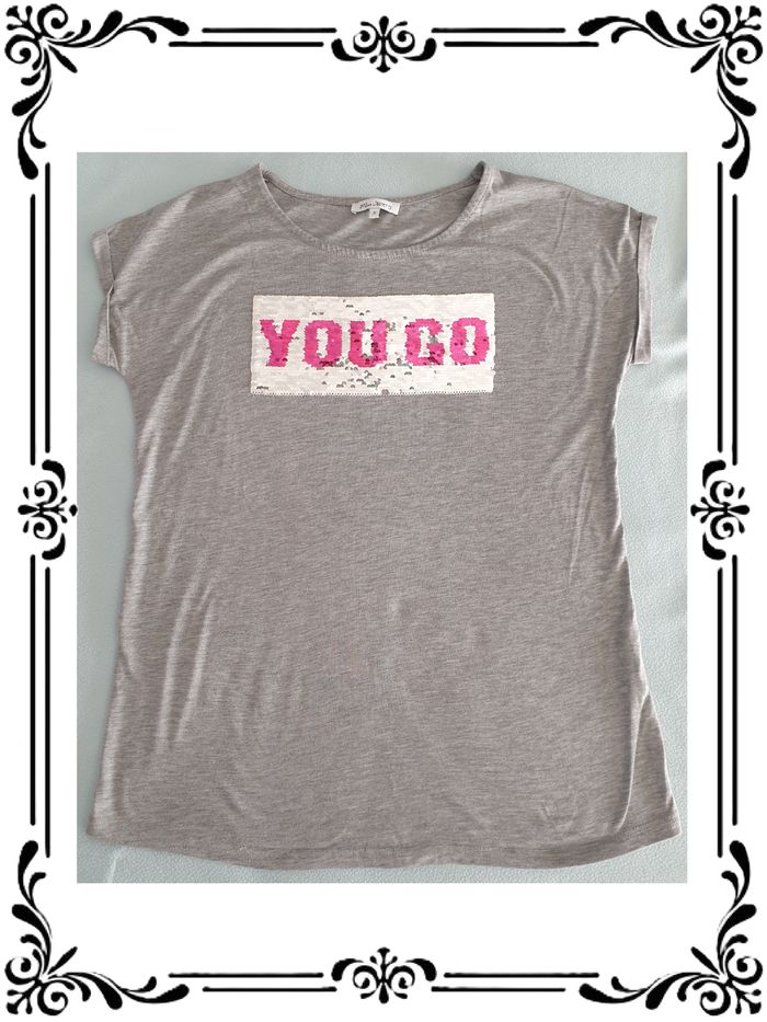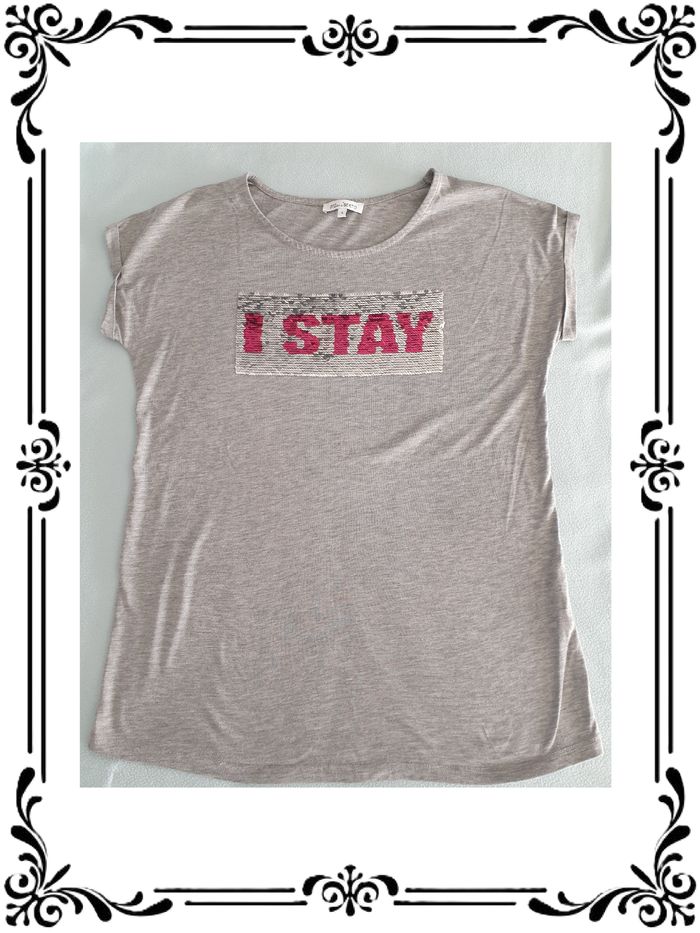 Tee shirt taille 36. Tee shirt manches courtes gris avec paillettes réversibles. Tissu extensible sur 6 cm. 66 % polyester, 34 % viscose. Largeur sous les bras: 47 cm Largeur à la taille : 45 cm Largeur en bas : 50 cm Longueur totale : 61 cm En très bon état. Miss Liberto. 3,00€. #vero38110vetementsfemme36