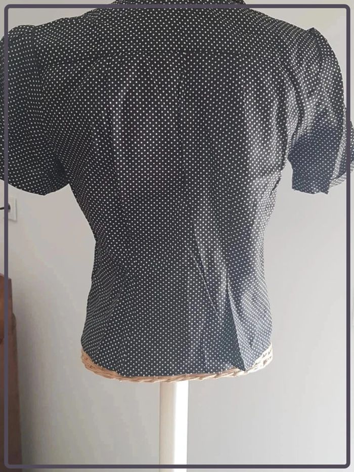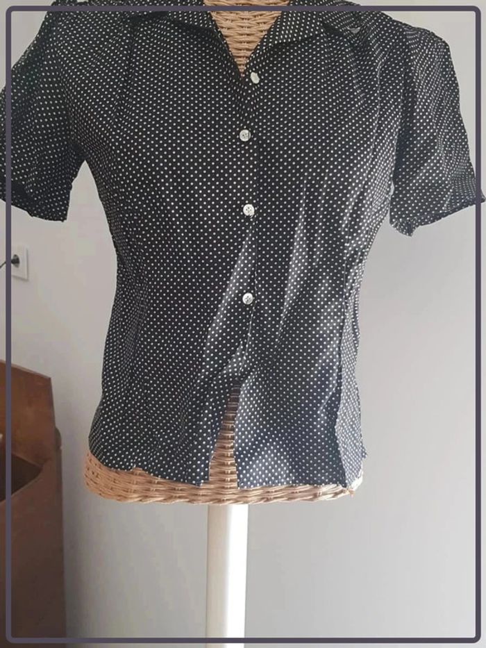 Chemisier manches courtes noir à pois blanc cintré et vintage. Neuf sans étiquette. Taille 44 mais plutôt un 38 de nos jours. En coton. Provient d'un vieux magasin. N'hésitez pas à regrouper vos achats pour optimiser les frais de ports. #vetementfemme38mykonoa #vetementneufmykonoa