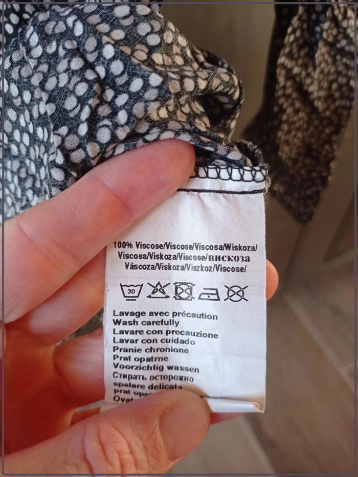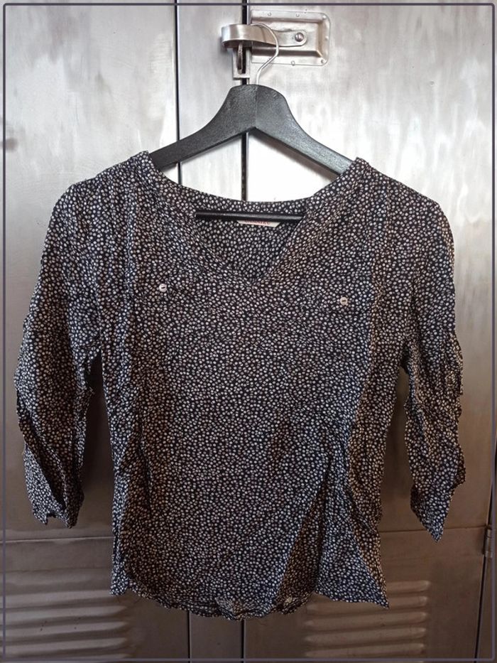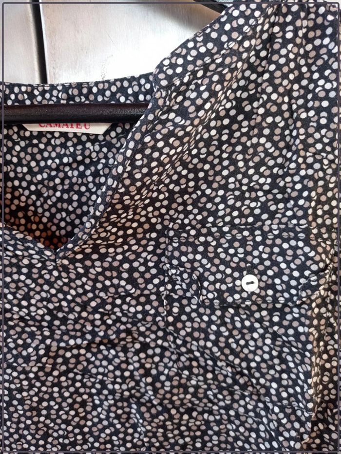 Chemiser manches ¾. De la marque « Camaïeu ». Très bon état. Taille 36. Noir avec motifs pois. 100% viscose. N’hésitez pas à regrouper vos achats pour optimiser les frais de ports. 1VF. #vetementfemme36mykonoa