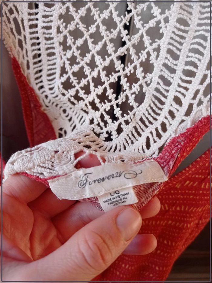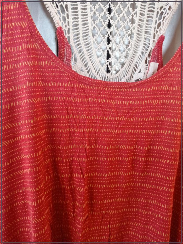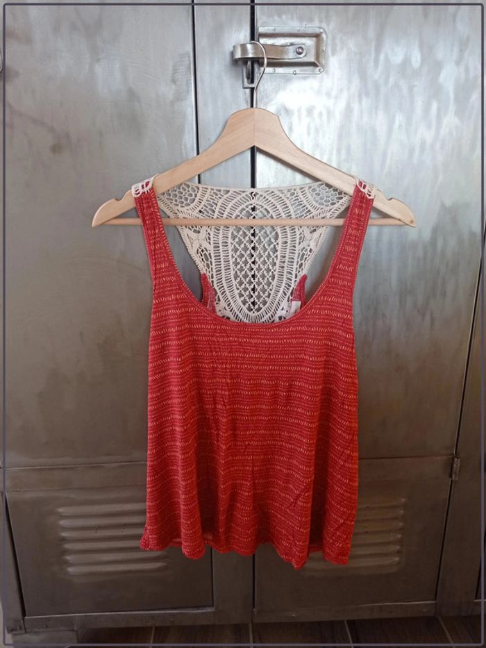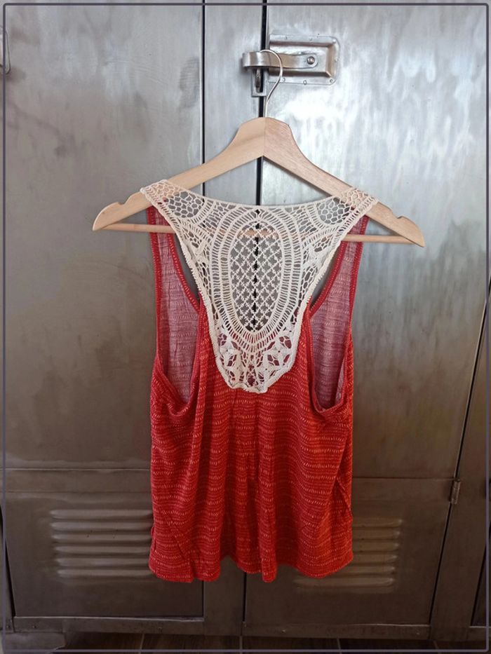Débardeur rouge/orange avec dos en dentelle/macramé. De la marque « Forever 21 ». Taille L. Bon état. N'hésitez pas à regrouper vos achats pour optimiser les frais de ports. #vetementfemme40mykonoa A4.