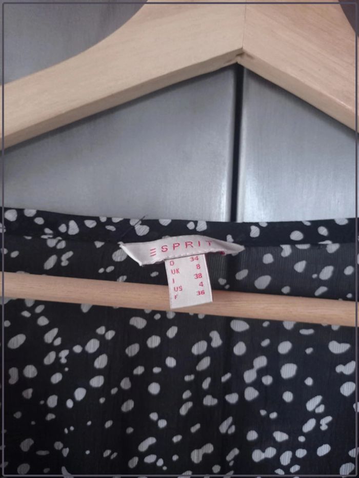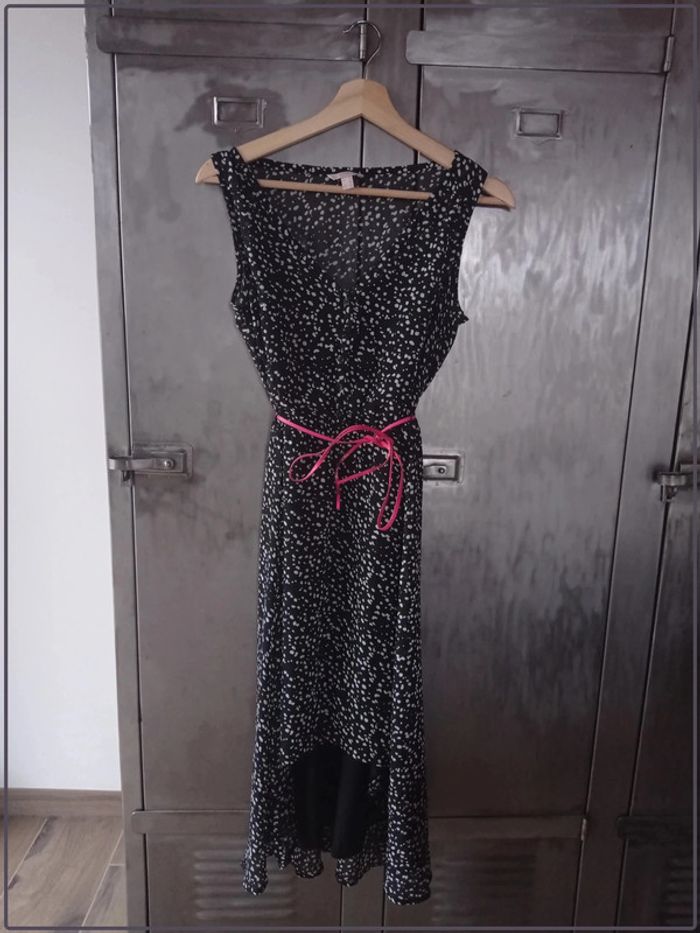 Robe longue noire à pois blancs. Courte devant, longue derrière. De la marque « Esprit ». Taille 36. Bon état. Vendue avec la ceinture. Une tâche blanche est présente sur la doublure (cf photos). N'hésitez pas à regrouper vos achats pour optimiser les frais de ports. #vetementfemme36mykonoa 10VF
