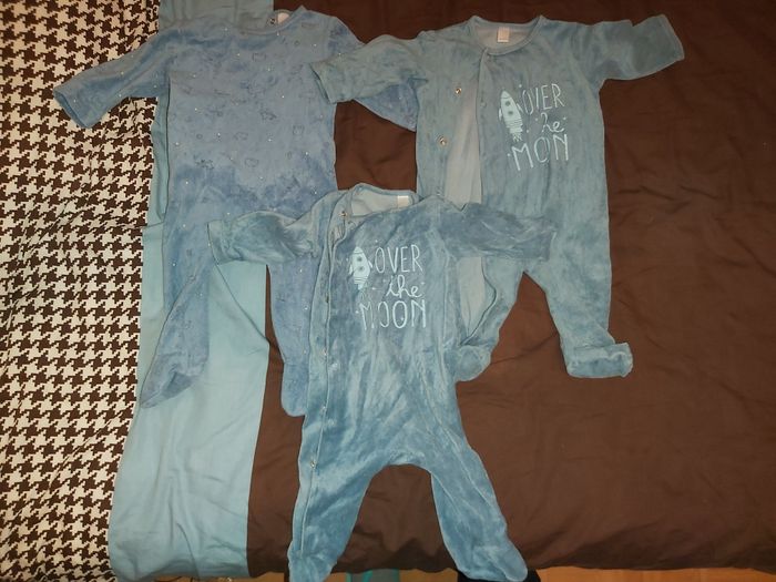 Vend 3 pyjamas de couleur bleu de marque tex taille 6 mois en bonne état Possibilité de faire un lot avec d'autre produit de mon dressing
