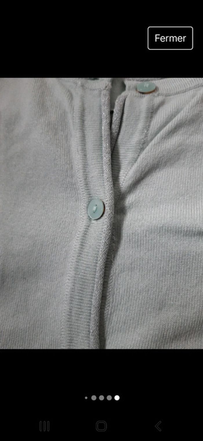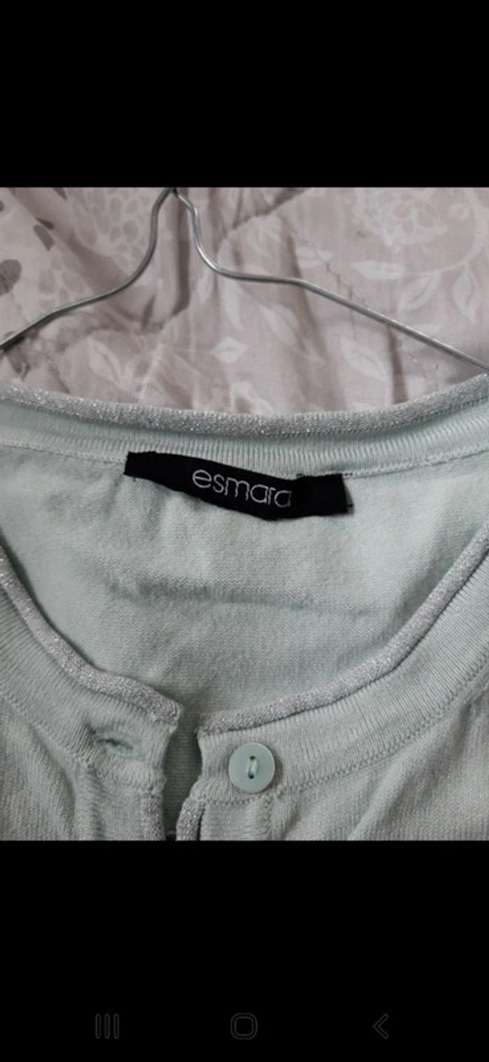 Gilet vert pastel Taille 38/ 40 Col et manches avec paillettes Aisselles à aisselles 46 cm Longueur 64 cm Porte 1 fois #sevileano_pulls Un polo même couleur existe dans mon dressing